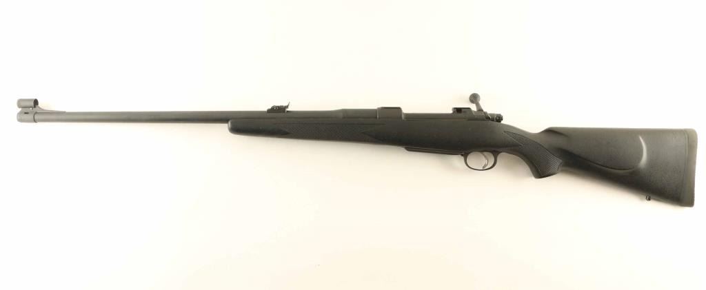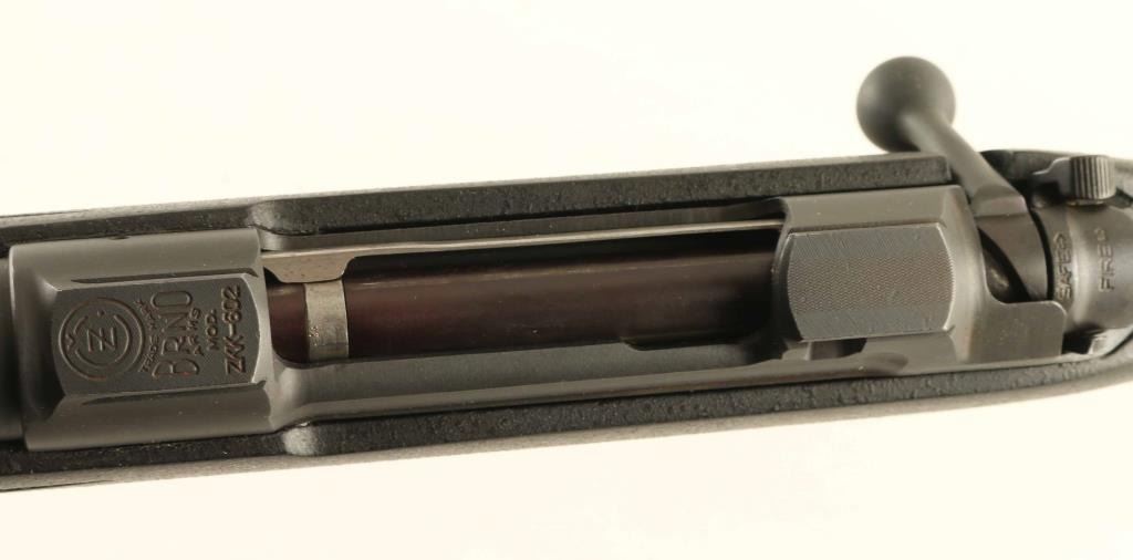 Czech bolt action rifle imported by Bauska Arms, Kalispell MT. Features matte blued finish, black composite stock (McMillan style) with checkered panels at wrist & forend, 26" heavy profile ported barrel with band type front sight ramp, hooded blade front sight, adjustable rear sight mid-barrel, manual safety, hinged floorplate, rear sling stud (front stud removed & hole filled), solid rubber recoil pad. Bore is very good condition. Overall condition is near excellent as custom built or re-built, with some scuffs to bluing and rub marks on bolt. Condition is NRA Excellent as re-built *** Modern Firearm ***