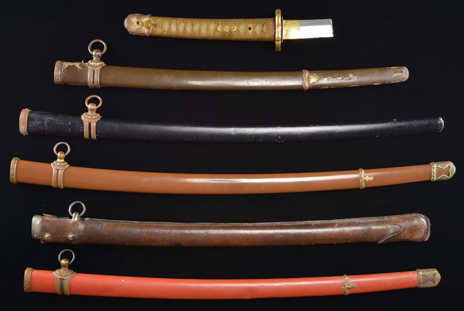 1) KATANA. This sword has only 3 1/4" of the blade remaining. However, the remainder of the sword is quite usable as parts. There is a gilded copper habaki with 2 seppa below the tsuba. The tsuba is gilded brass of standard 4 cherry blossom design above & below. White same with brown tsuka-ito. Matching gold highlighted bronze kabuto-gane & fuchi. Gilded 3 cherry blossom menuki. Nakago has not been inspected. CONDITION: habaki, tsuba & tsuka show light wear. 2) SAYA. This saya measures 28 1/2" long and has a red painted non-ferrous body with gold highlighted brass/bronze mounts. CONDITION: saya has 2 small dents and finish may be repainted. 3) SAYA. This saya measures 30 1/8" long and has a brown enameled iron body with gold highlighted brass/bronze mounts. CONDITION: saya is free from dents and has nearly all of the original finish remaining. 4) SAYA. This saya measures 24” long and has a dark field green enameled wooden body with gold highlighted brass/bronze mounts. CONDITION: the tip mount is missing and there are losses to the enameled finish. 5) SAYA. This saya measures 28 5/8” long and has a black enameled finish on an iron body with gold highlighted brass/bronze mounts. CONDITION: the tip mount is missing and the saya body has minor finish losses. 6) SAYA. This saya measures 27” long and has a chrome plated iron body. The saya is nearly completely covered in brown leather with snaps at the top. CONDITION: saya appears to show light wear. Leather cover has minor losses at the top. PROVENANCE: From the Lifelong Collection of Glen E. Mattox. (02-18955-1/BF). $300-500.