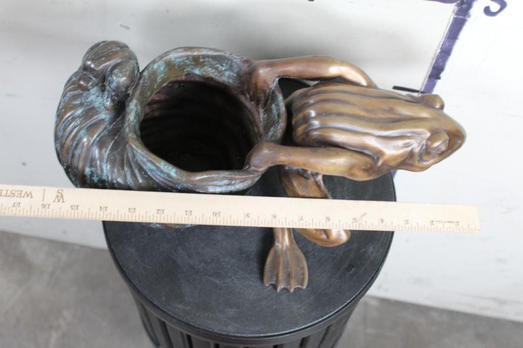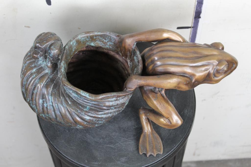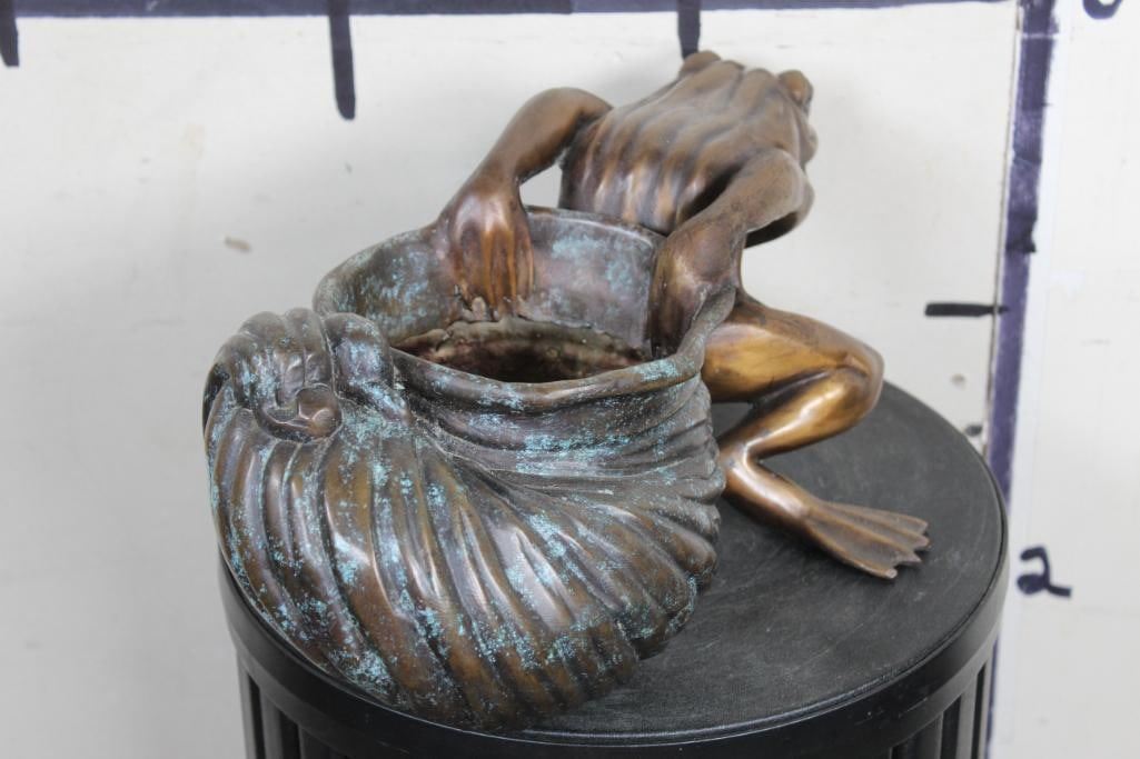 BRONZE FROG Pulling a BRONZE SNAIL Sculpture. It could be used as Planter or Decorative Bowl and measures 6" Tall x 8" Wide x 15.75" Long. The Total Weight is 9lbs 10oz. COLLECTIBLE ART BRONZE SCULPTURES