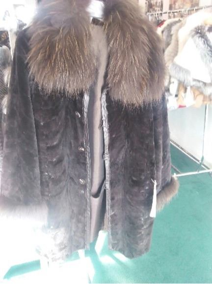 Up for auction is a brown dyed sheared mink 3/4 coat with dyed raccoon collar and cuffs. This coat