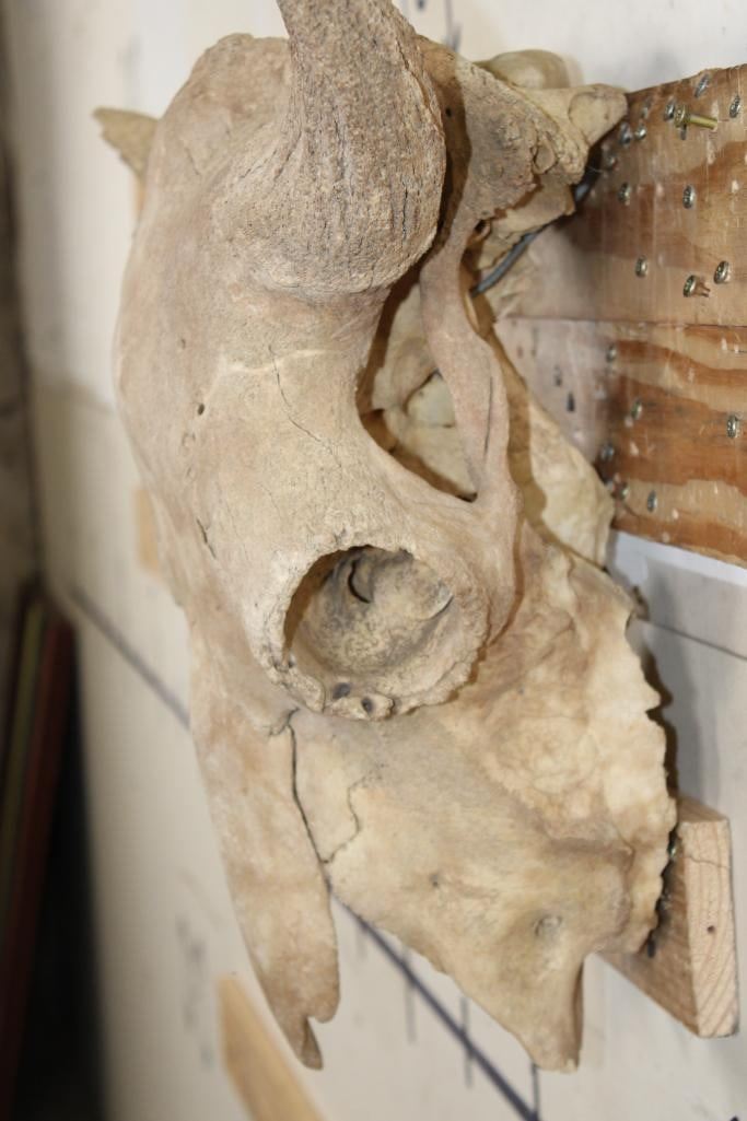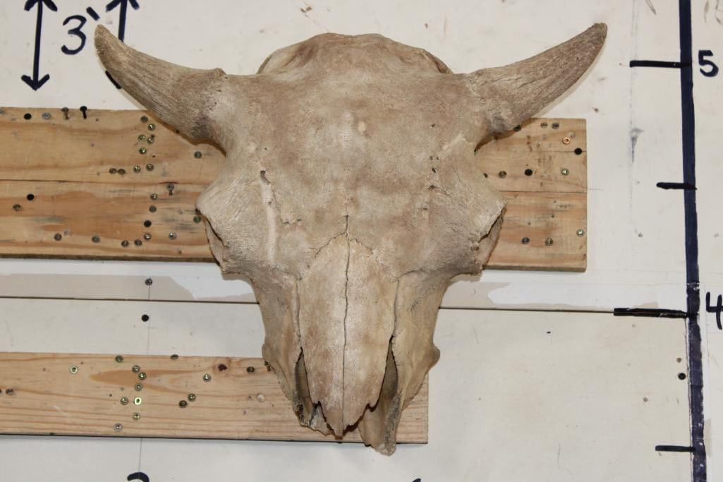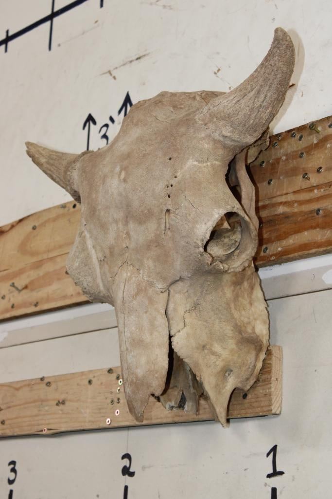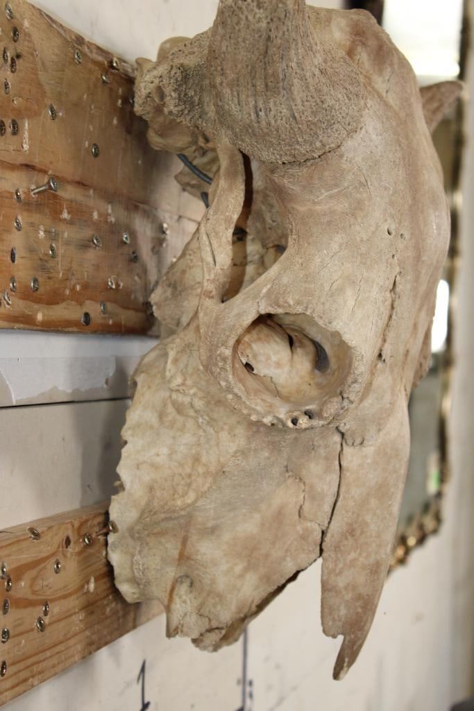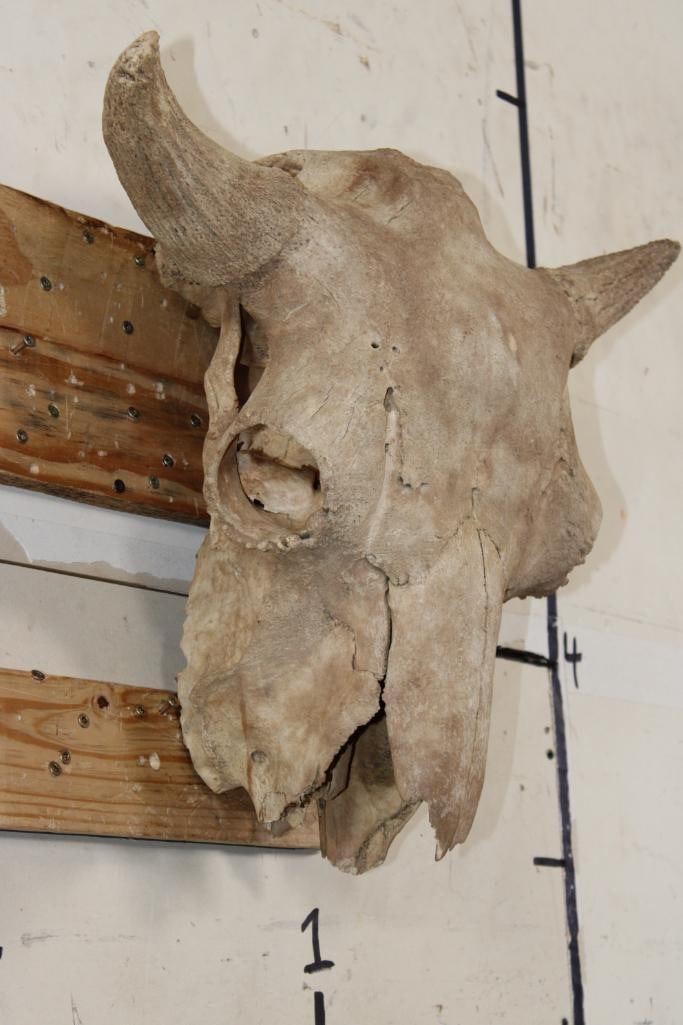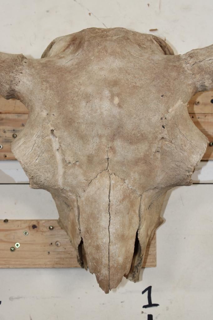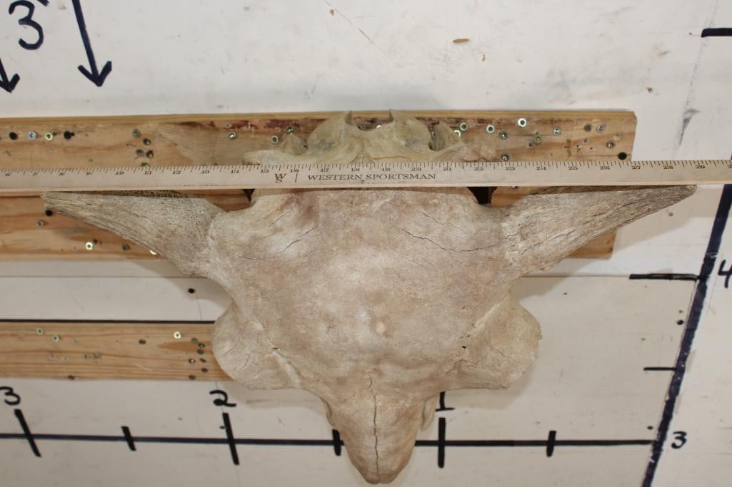 This is an Older BUFFALO or BISON Skull with no teeth. It measures approximately 22" Wide x 18" Tall and has a heavy duty wire hanger for display. TAXIDERMY