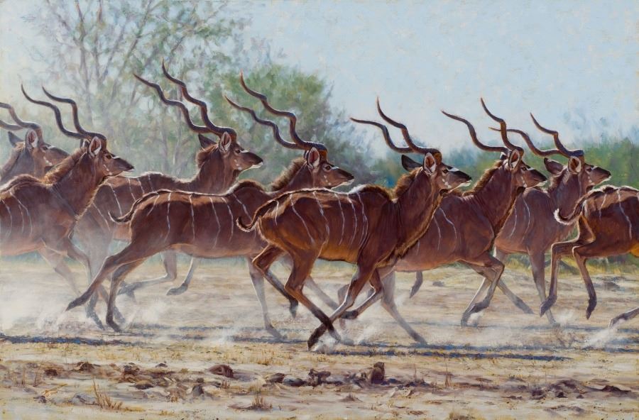 by John Banovich – This 27”x39” Giclee portrays a large herd of Kudu Bulls kicking up dust as they run from something unforeseen.