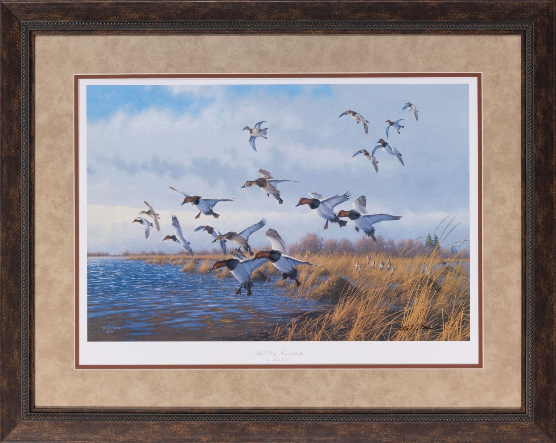"Back Bay - Canvasbacks," an exquisite work by Michael Sieve, transports viewers to a tranquil scene where the delicate balance of nature is frozen in time. In this artwork, a group of Canvasbacks are elegantly captured in mid-flight, their wings gracefully cupped as they descend toward a serene cove. The artist's keen eye for detail and mastery of his craft bring these waterfowl to life, showcasing their vibrant beauty against the backdrop of the bay. Sieve, a self-taught artist from the picturesque landscapes of Minnesota, once again proves his prowess, marking his fourth appearance in the National Art Package. This piece not only captures the essence of the Canvasbacks' elegance but also celebrates Sieve's unwavering dedication to his artistry and his remarkable journey as an artist.