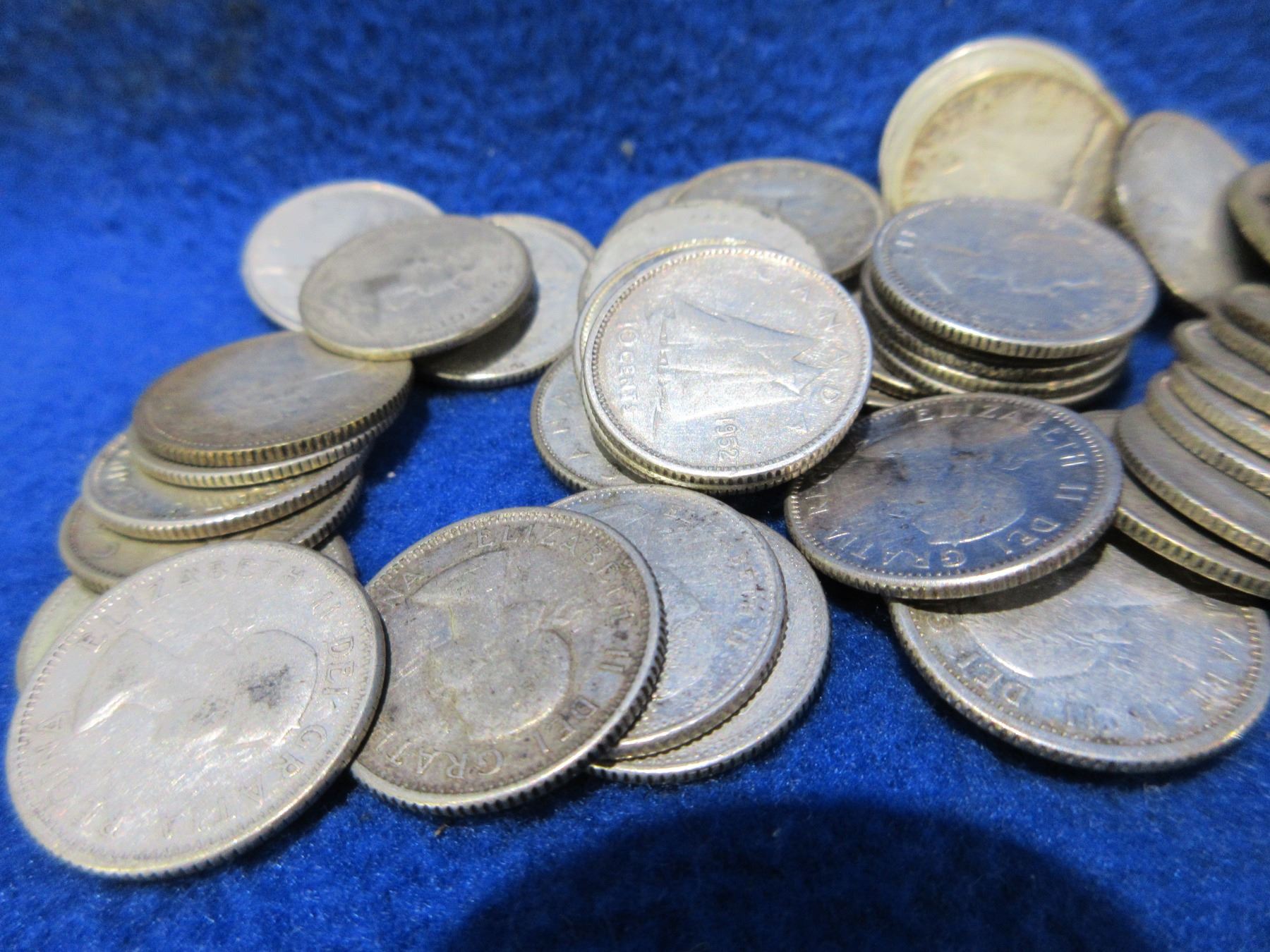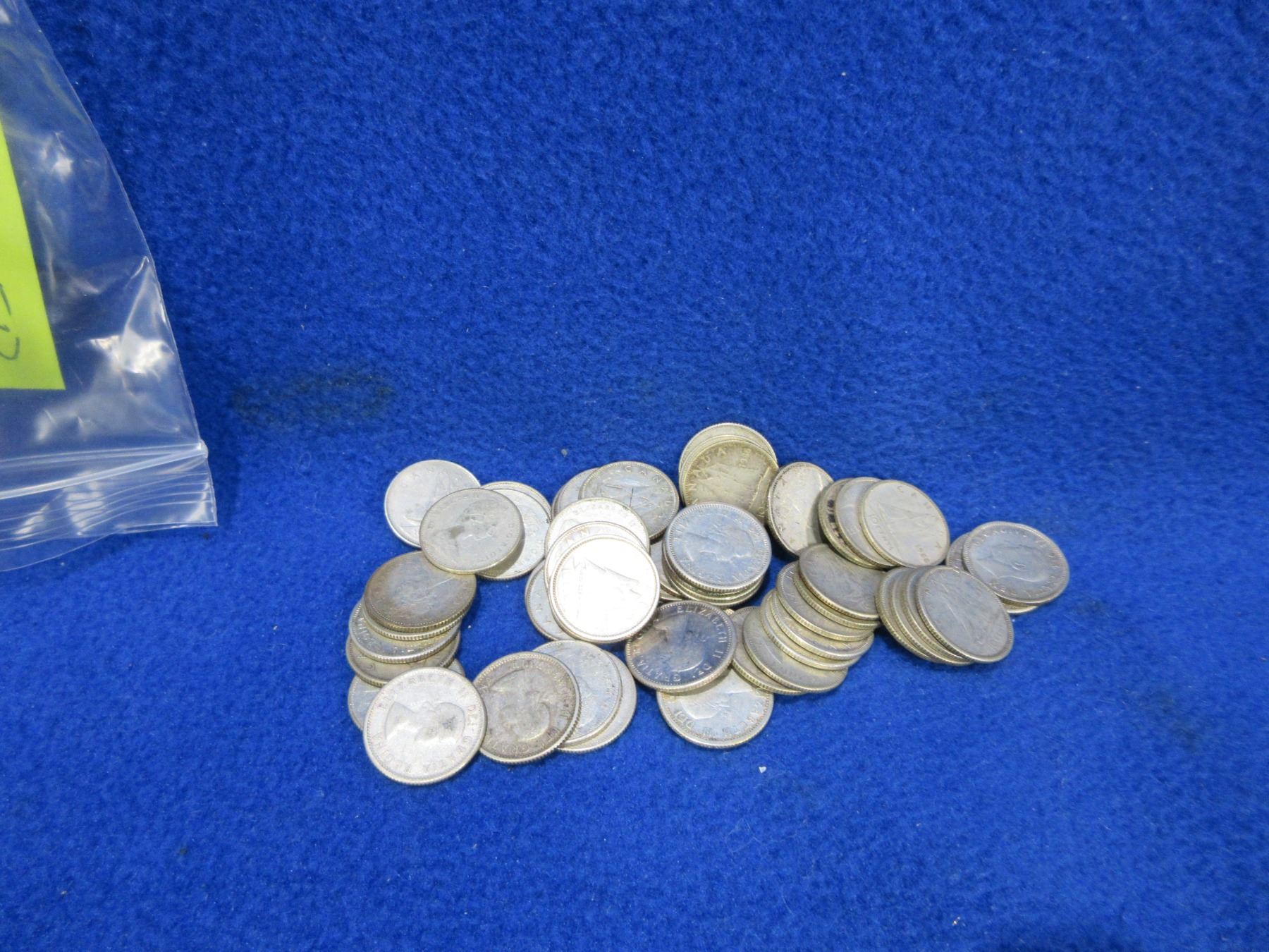 Bag of 53 Canadian Silver Dimes - Approximately 1951 to 1968 - Total Weight 126.1 Grams