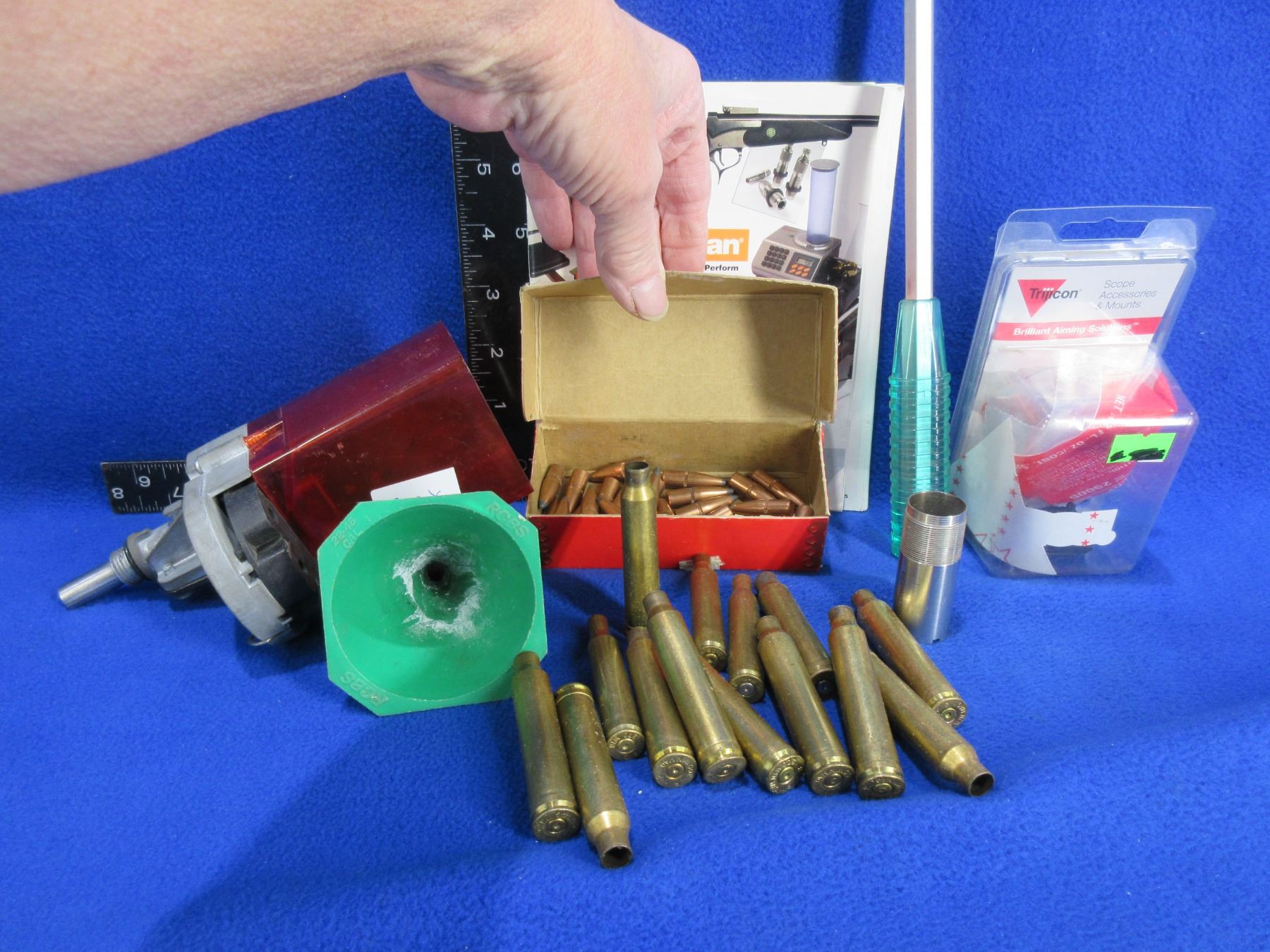 Bag of Assorted Reloading Equipment - Bullet Puller, Powder Measure, Funnel, 14 Assorted Brass, Remington Modified Choke Tube, Hornady 30 Cal 165 Grain Bullets (Box of 28), Trijicon Scope Mount Accessories, Lyman Product Catalogue