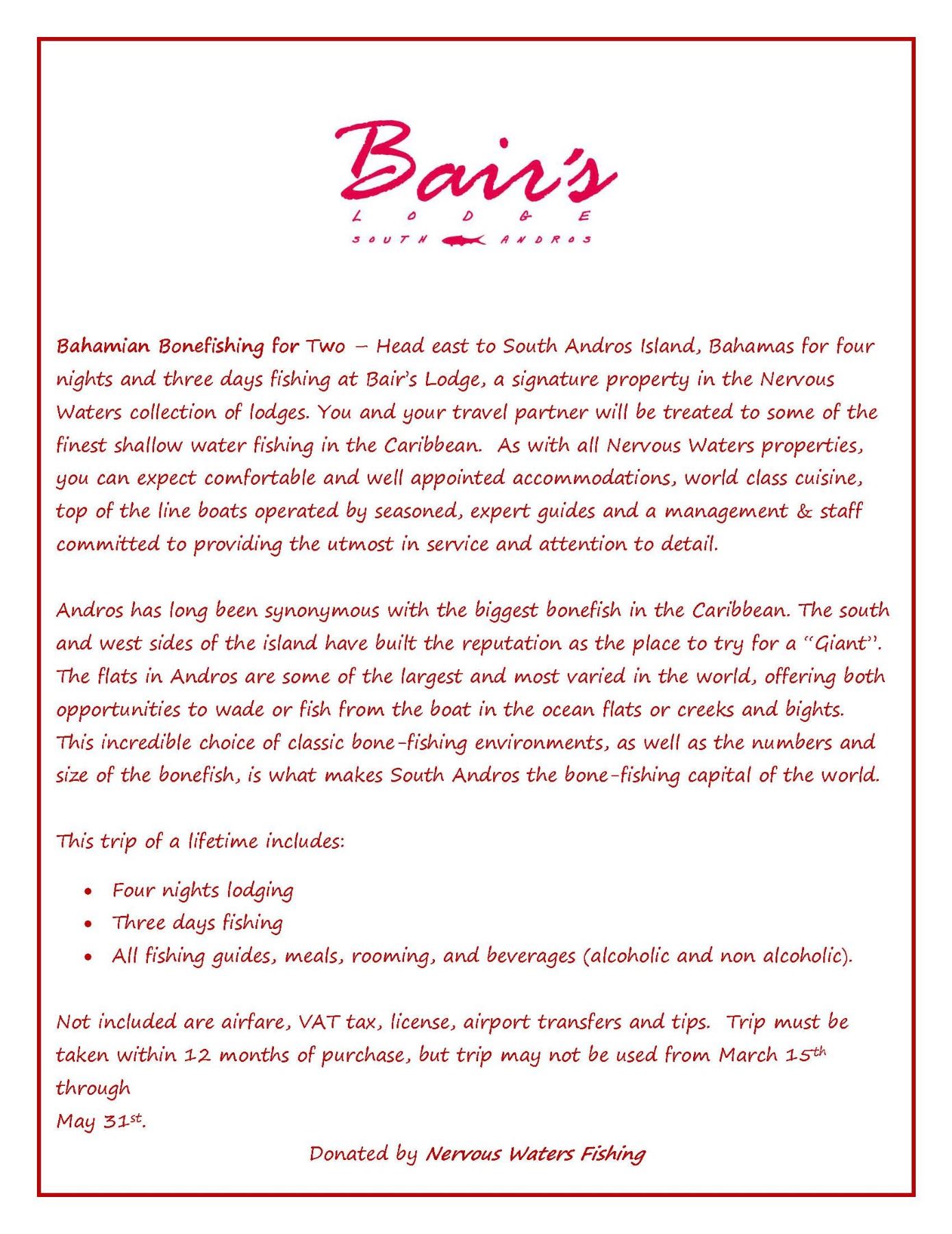 Head east to South Andros Island, Bahamas for four nights and three days fishing at Bair’s Lodge, a signature property in the Nervous Waters collection of lodges. You and your travel partner will be treated to some of the finest shallow water fishing in the Caribbean. As with all Nervous Waters properties, you can expect comfortable and well appointed accommodations, world class cuisine, top of the line boats operated by seasoned, expert guides and a management & staff committed to providing the utmost in service and attention to detail. Andros has long been synonymous with the biggest bonefish in the Caribbean. The south and west sides of the island have built the reputation as the place to try for a “Giant”. The flats in Andros are some of the largest and most varied in the world, offering both opportunities to wade or fish from the boat in the ocean flats or creeks and bights. This incredible choice of classic bone-fishing environments, as well as the numbers and size of the bonefish, is what makes South Andros the bone-fishing capital of the world. This trip of a lifetime includes: • Four nights lodging • Three days fishing • All fishing guides, meals, rooming, and beverages (alcoholic and non alcoholic). Not included are airfare, VAT tax, license, airport transfers and tips. Trip must be taken within 12 months of purchase, but trip may not be used from March 15th through May 31st . Donated by Nervous Waters Fishing