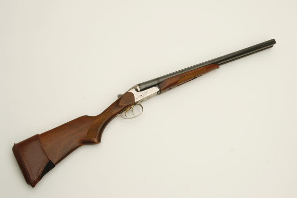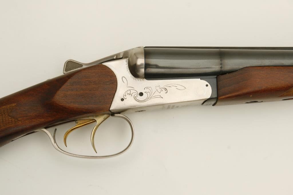 gauge, serial #0452110B. The shotgun is in very good overall condition with 20 ½” barrels. The barrels retain nearly all of their blued finish, while the receiver is coin finished with impressed detail. The smooth wood stocks are in very good condition also with only minor handling marks and a leather covered slip on butt plate providing a 15” LOP to the front trigger. The bores are very good, the action crisp and markings are sharp. (Modern) Est.: $140-$280.