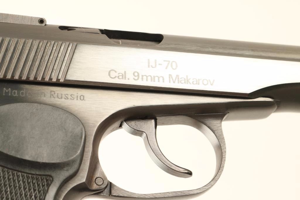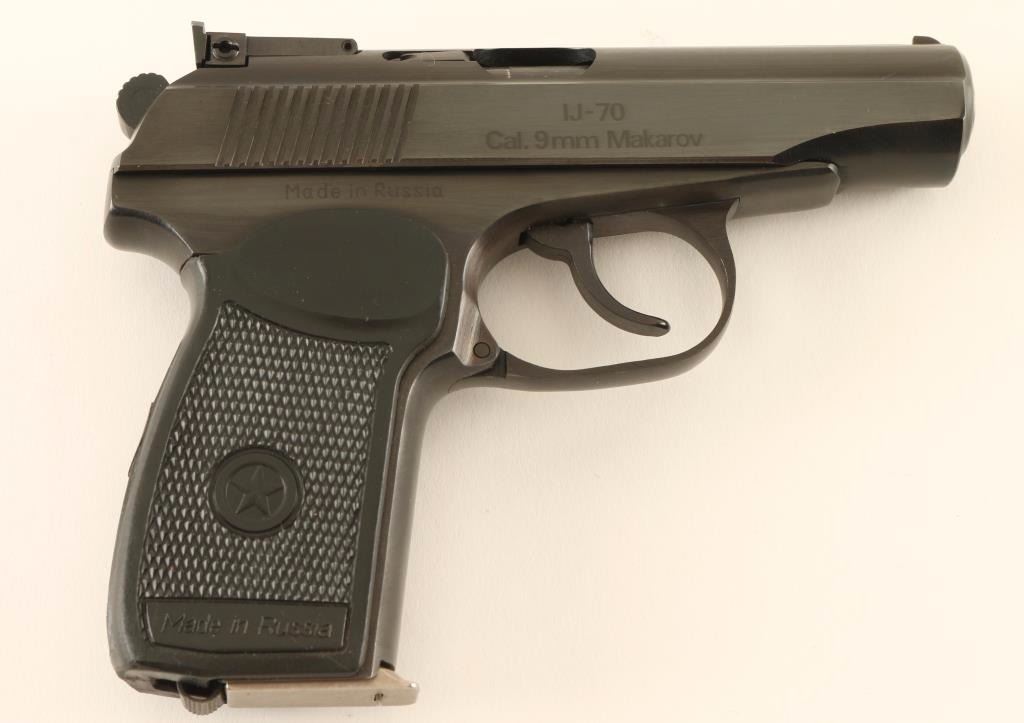 Russian made double action semi-automatic pistol chambered in 9x18mm Makarov. Features a blued finish, 3.8" barrel, fixed patridge front sight, adjustable rear window sight, smooth trigger, serrated round hammer spur, thumb safety, 8 round magazine, steel frame and one-piece checkered black plastic wrap-around grip with Baikal insignia & lanyard loop. Includes a smooth brown leather belt loop holster with cleaning rod and spare magazine. Pistol exhibits approximately 99% of it's original blued finish showing slide wear on the slide from the safety lever with no other wear observed. Action is strong, bore is pristine and plastic grip is fine. Condition is excellent. ***Modern Firearm***