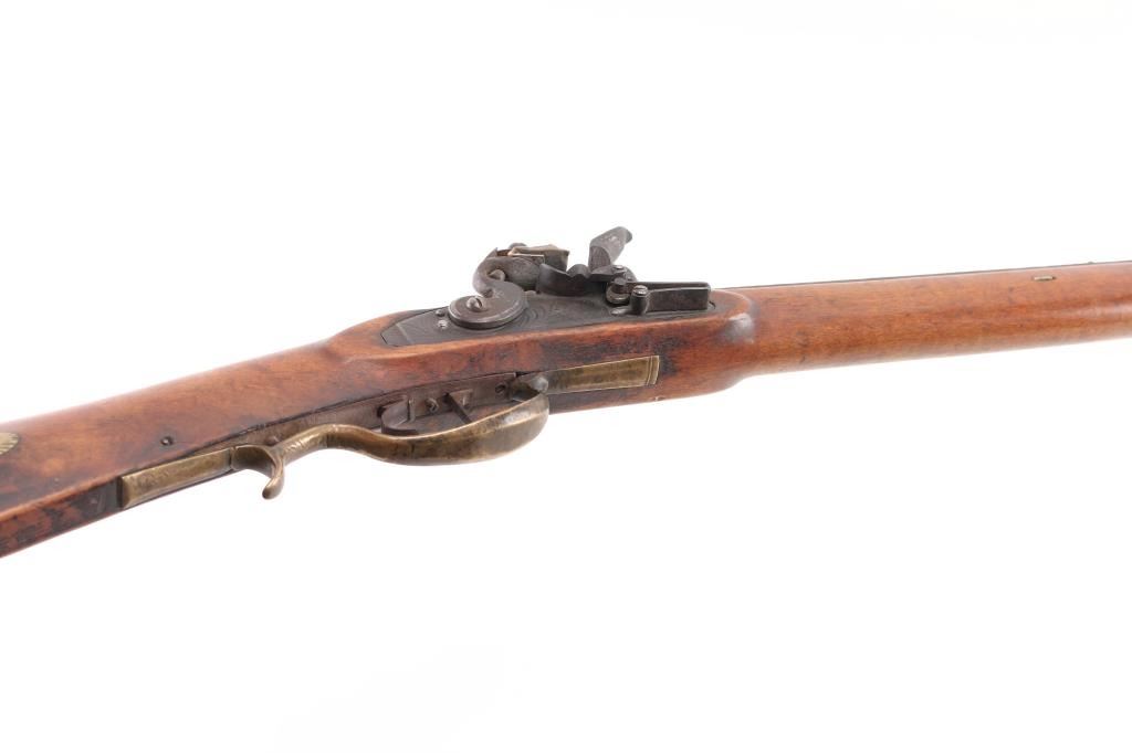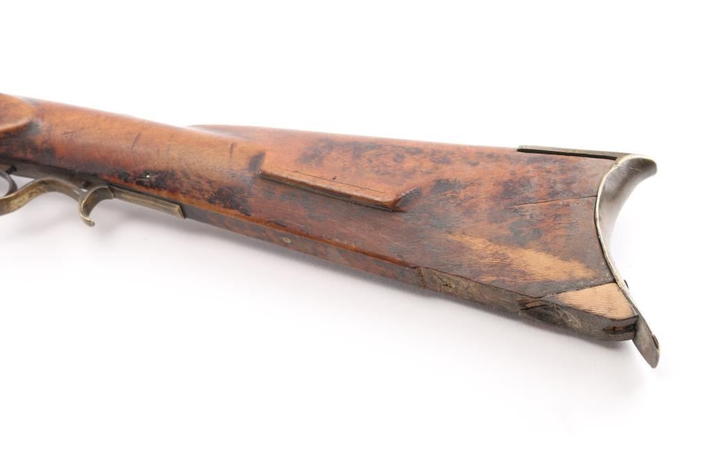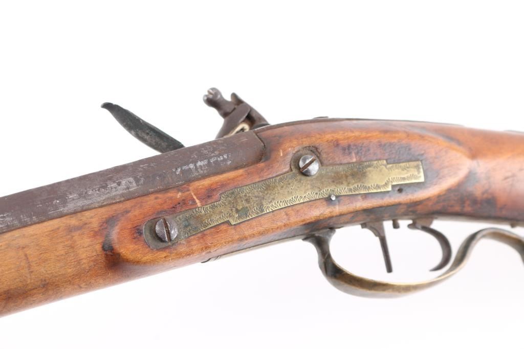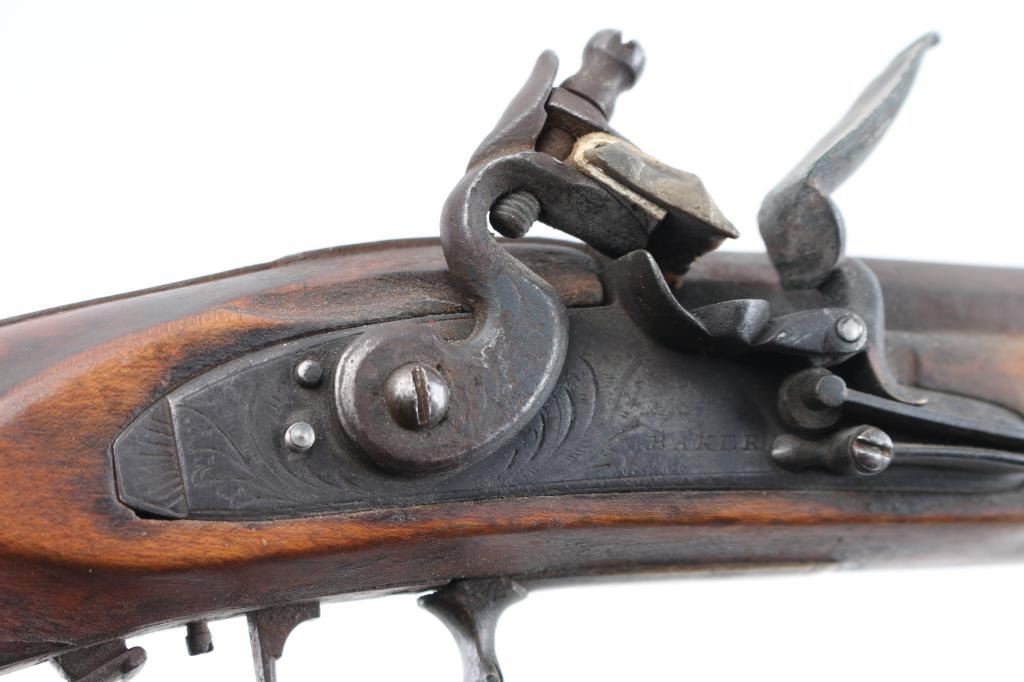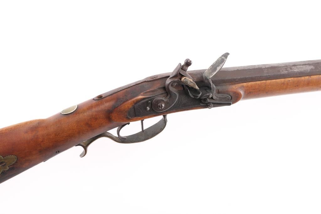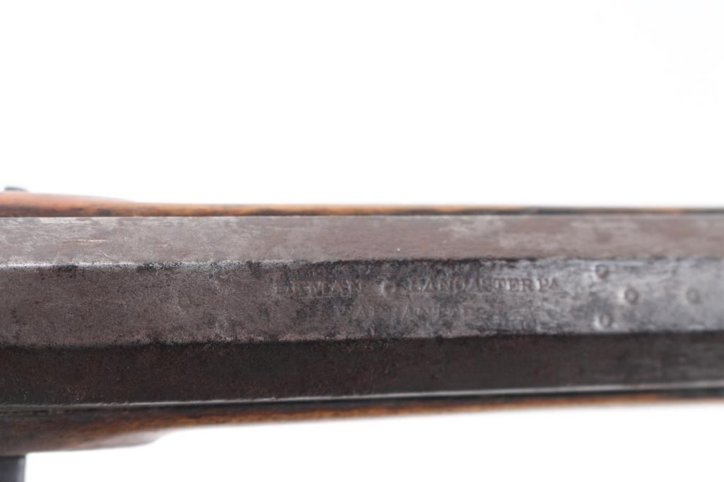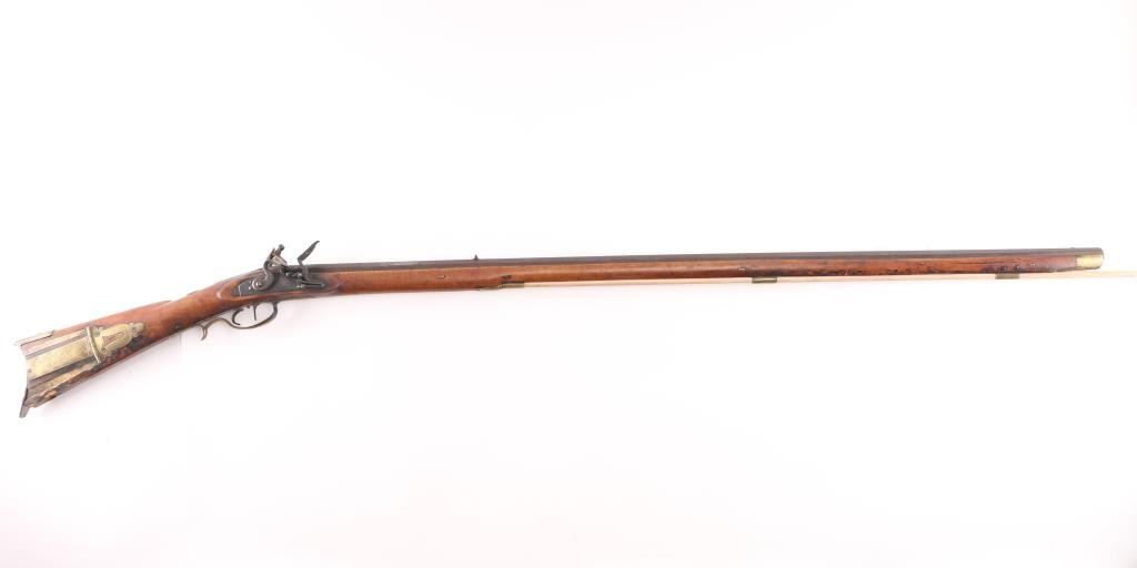 Antique single shot flint lock rifle for black powder. Approximately 54 caliber. Marked "BAKER" on lock, "LEMAN LANCASTER PA" and "WARRANTED" on barrel. Features browned finish, 44" octagon barrel, blade front & notch rear sights in dovetails, single trigger with adjustment screw, brass fittings, patch box, crescent butt plate, replacement ramrod (needs fins trim), scant right hand cheek piece, simple decorative border stampings or engraving on lock plate & serpent. Missing rear tang screw. Bore is dirty and a bit dark, strong rifling. Barrel shows erosion of sharp edges along flats, brown color with rough texture from pitting, much patina, bare metal along high spots. Brass pieces show mellow patina color. Wood is fair, sanded, dark staining retained in may places, missing wood from toe. Lock needs adjustment or repair. Condition is NRA Good *** Antique Firearm ***