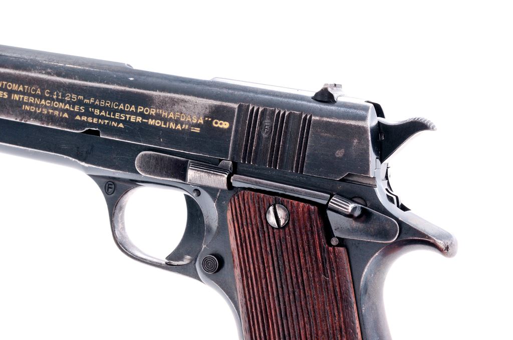 Ballester-Molina Semi-Automatic Pistol, #34485, .45 ACP cal., 5'' barrel, blue finish, grooved factory grips, with additional number ''69171'' at base of mainspring housing. All matching numbers, except magazine. Condition is near fine retaining approx. 85%-90% thinning blue, with most of the losses to left side of slide. Grips and action are good, bore is fine. Lightly import marked just forward the serial number. Est.: $450-$650. (C&R/PPT)