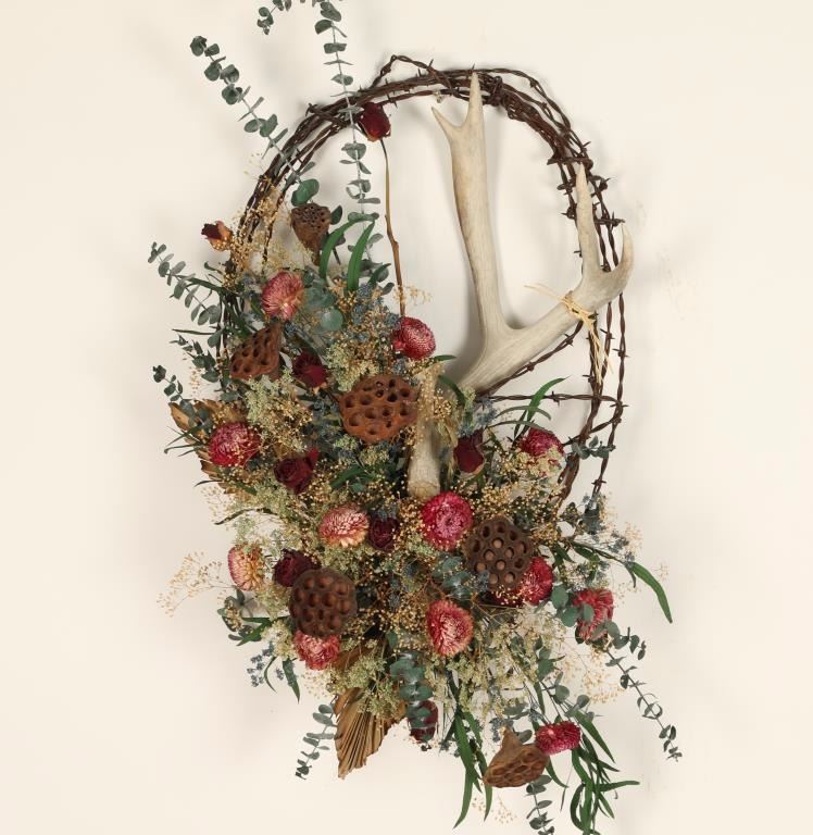 Barbed wire loop accented with upright antlers that are surrounded by cascading dried flowers, eucalyptus and lotus pods. Measures approx. 31"l x 17"w. Great decor for cabin.