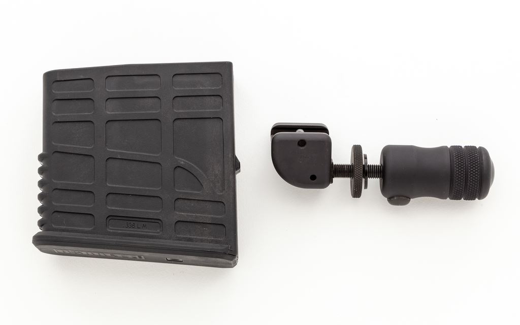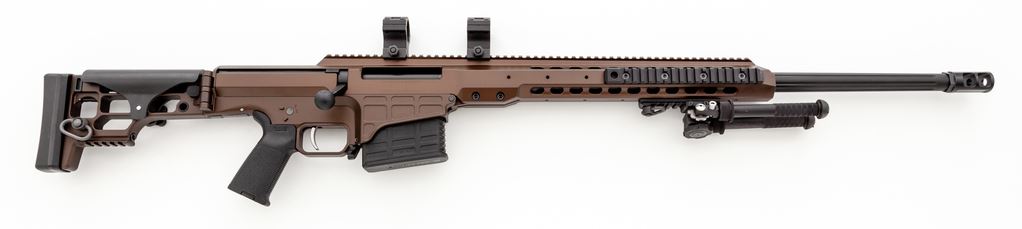 Barrett MRAD Long Distance Bolt Action Rifle, with Pelican hard case, #AJ001550, in .338 Lapua mag. cal. The 26'' fluted matte black barrel measures 27-3/4'' overall including the muzzle brake. The aluminum receiver with a Burnt bronze Cerakote finish, full pistol grip, 22'' integral 30 MOA upper optics rail, Barrett scope rings, with 8'' rail added to the right side; 4'' added lower rail. Skeletonized folding stock with black rubber recoil pad and adjustable cheekpiece. Rifle also features a thumb operated safety, sling swivels, Atlas Bipod, and match grade trigger. Condition is excellent, appearing near new overall, showing a few insignificant handling marks and signs of mild range use. Action is smooth, with a mint bore. Est.: $4,000-$5,500. (Modern)