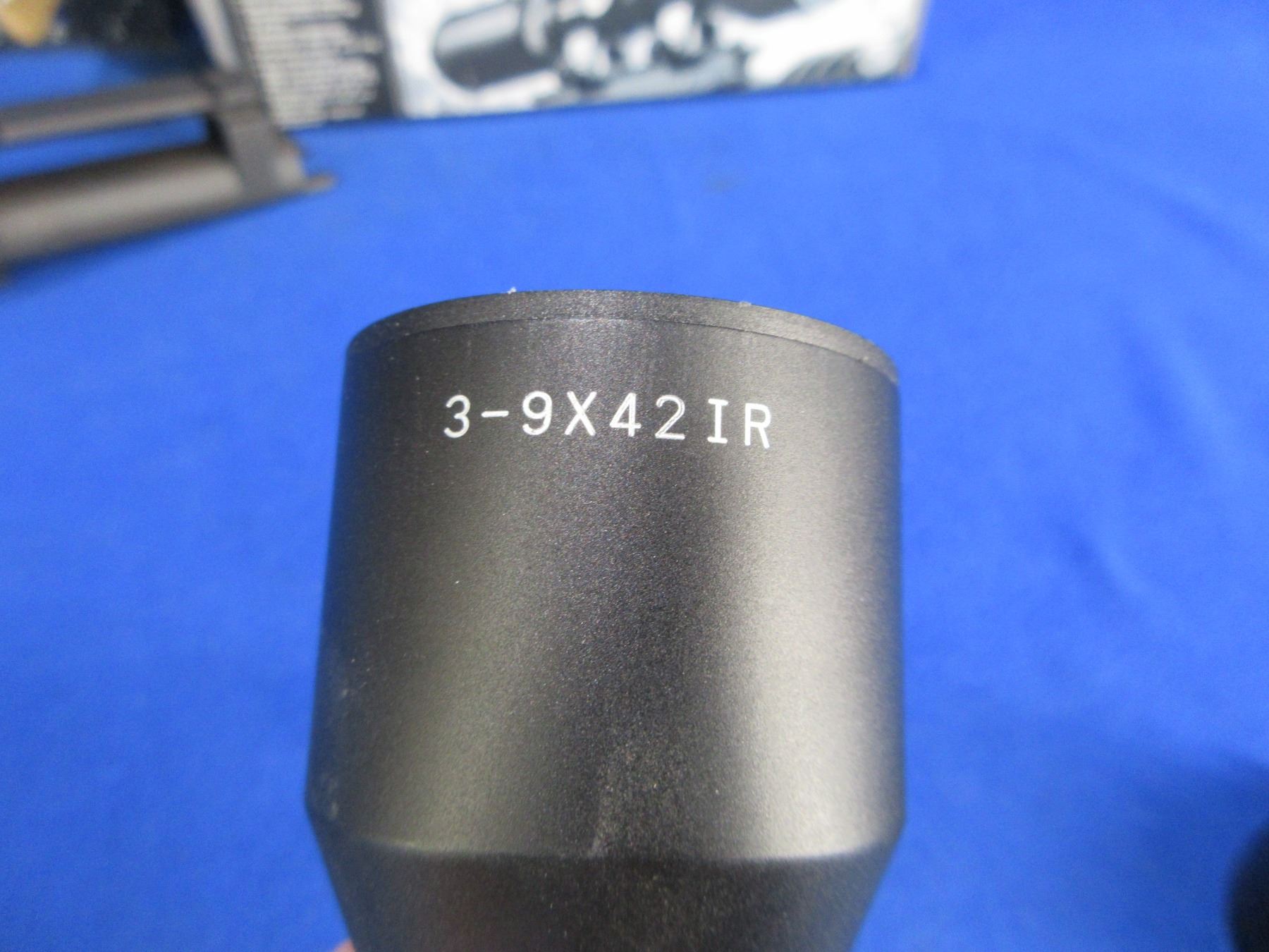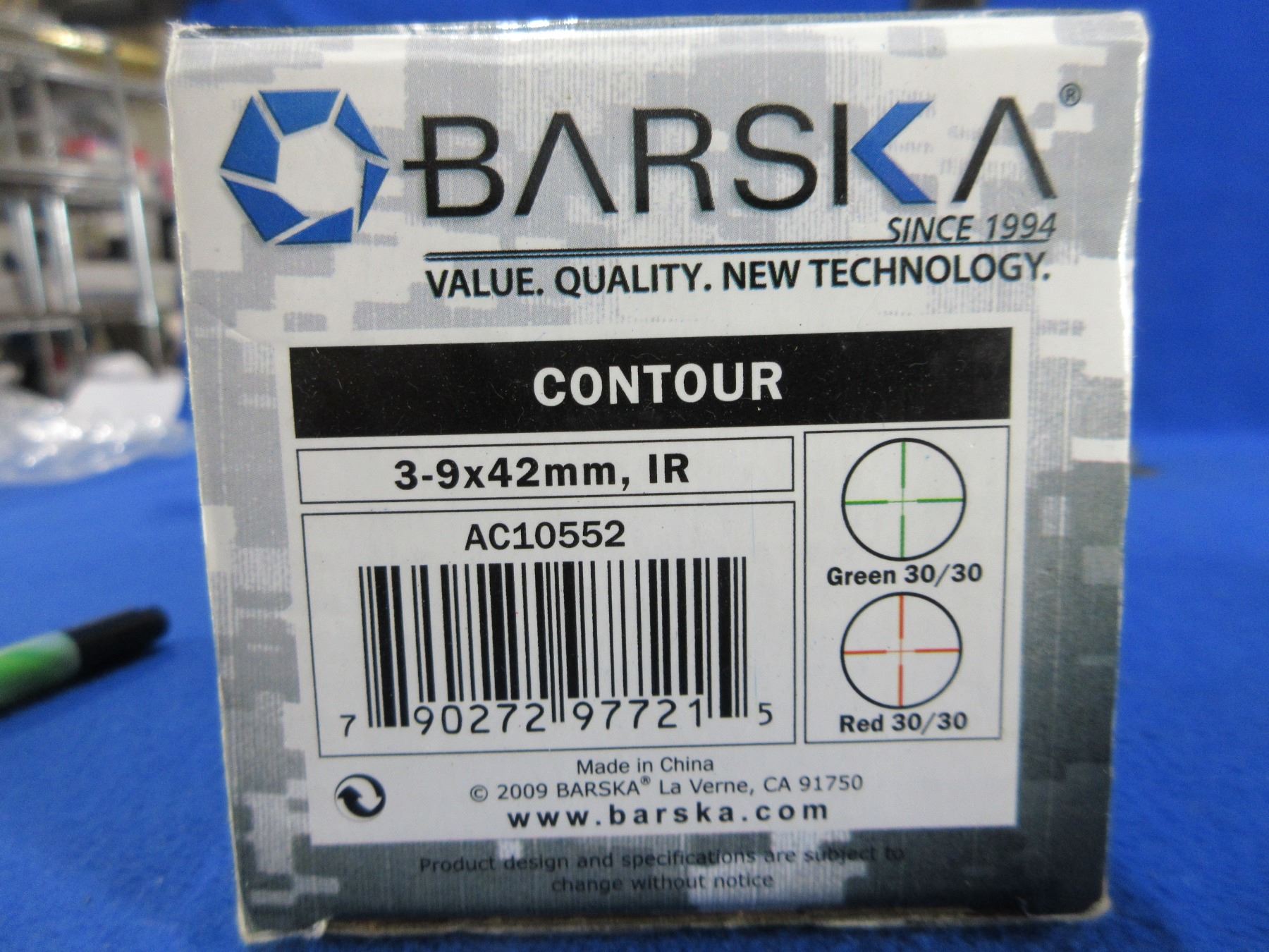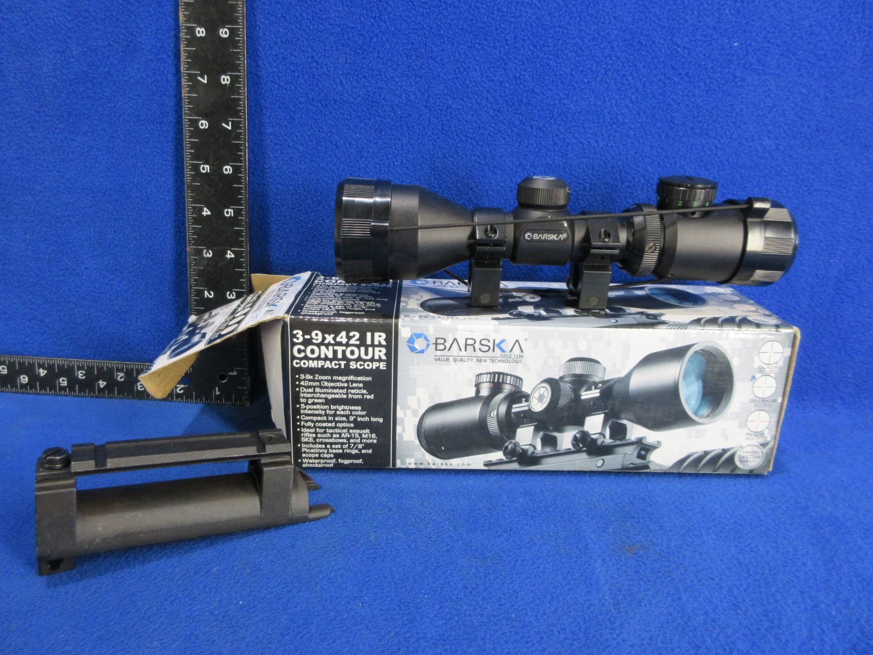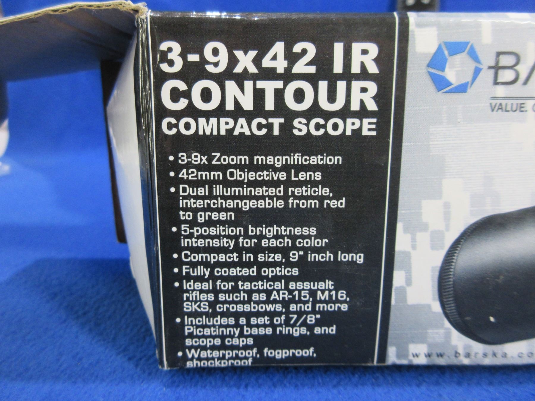 Barska 3-9x42 IR Contour Compact Scope w/ 7/8" Picatinny Rings & Mount - Appears Clear, Duplex Reticle - Green and Red IR tested working at time of cataloging, comes with lens covers and original box.