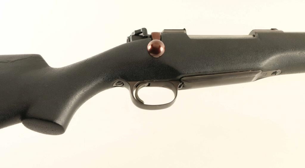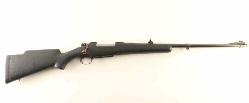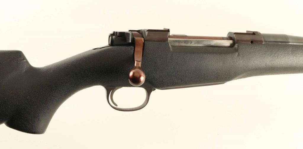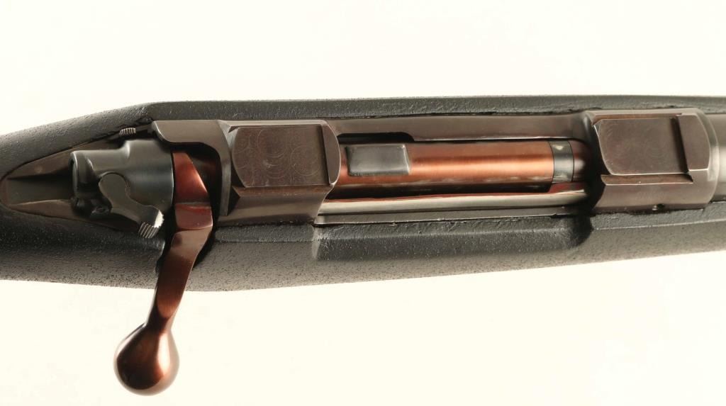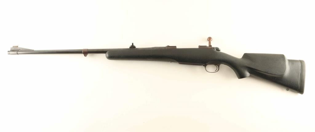 Custom bolt-action rifle built on a small production custom magnum action (action made in Montana) by Fred Wells of Prescott. The heavy profile 26" ported barrel and over-size safari sights were custom made by Fred Wells. The front sight blade includes a large cylindrical top which shows as a bead shape to the user, is mounted on a banded ramp. Rear sight is adjustable for windage, with large "V" notch and stippled anti-glare panels forward and behind on flats parallel to the barrel. Receiver is square bridge with dovetails on sides of flats, optimized for scope mounting. Manual safety is a three position low profile for scope clearance. Receiver is not drilled & tapped, no scope mounted. Floorplate is hinged with push button release. Stock is a textured black paint finished composite, with raised right hand cheek piece and solid recoil pad. Sling studs are installed, front stud mid-barrel on a band. Condition is excellent with some handling marks, bright metal on bolt body from rubbing during operation. Many metal parts show a purplish or plum colored hot blue typical of very hard or special composition steel. Condition is NRA Excellent as rebuilt *** Modern Firearm ***