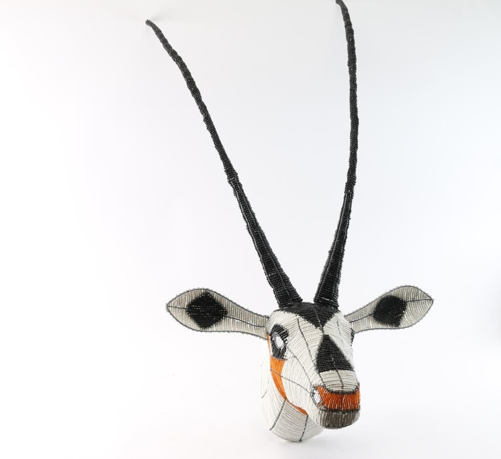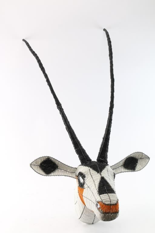 Wall mount of a beaded animal head resembling a Sable or similar antelope.