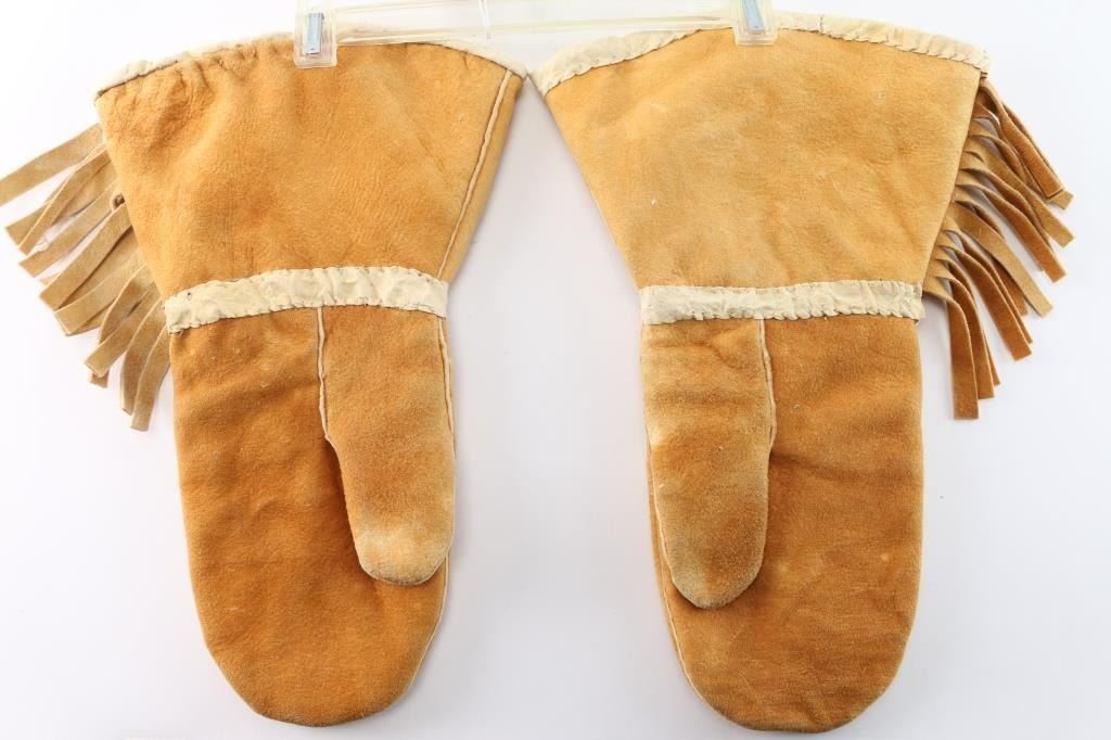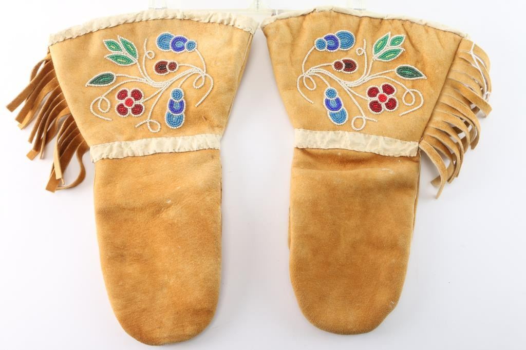 Tanned Moose hide with fringe and floral motif.