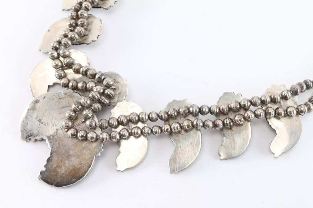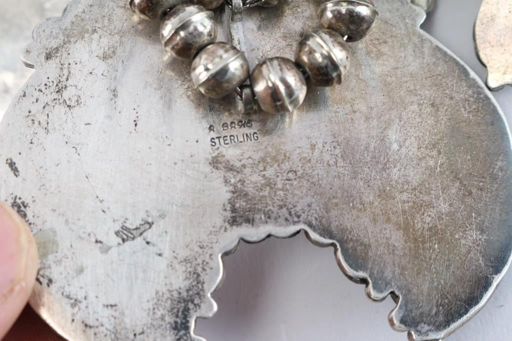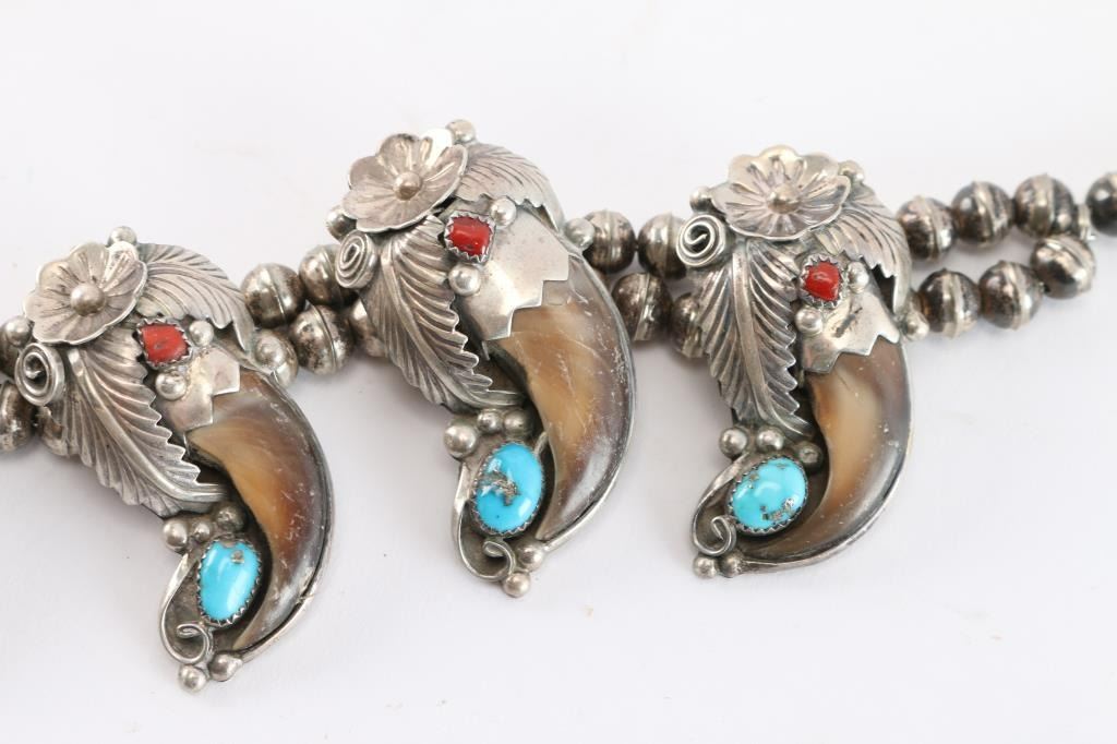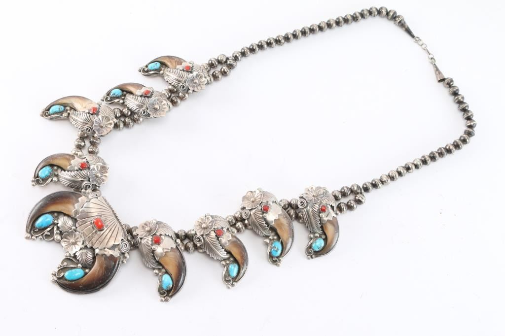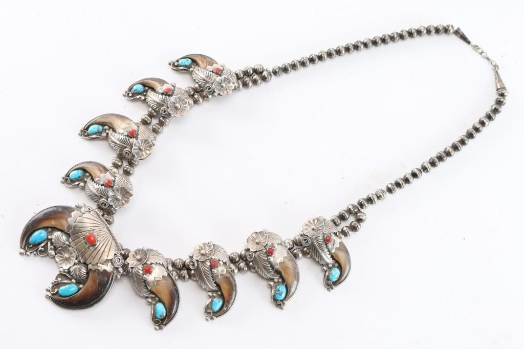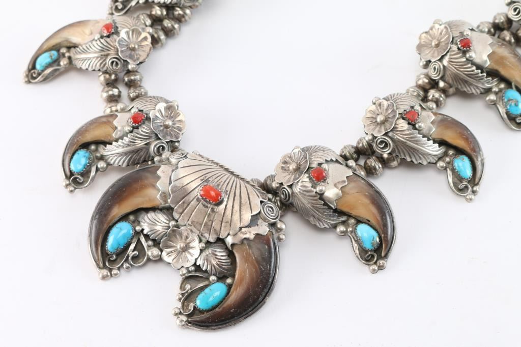With turquoise, coral and bear claws set in intricate sterling silver design. Maker marked by noted silversmith R. Bahe. Purchased from Grizzly Taylor, renowned collector and owner of The Hideaway Grill in Cave Creek, Arizona. Measures 16" from drop. CANNOT BE SHIPPED TO CALIFORNIA OR NEW JERSEY.