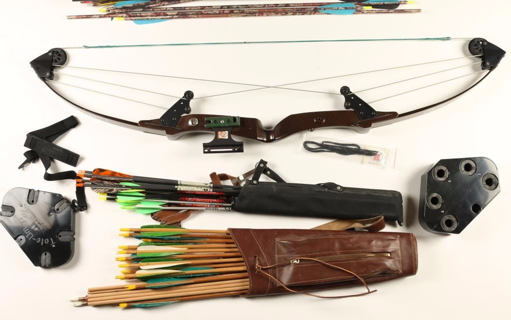 Vintage bow with carrying case, two quivers and lots of arrows.