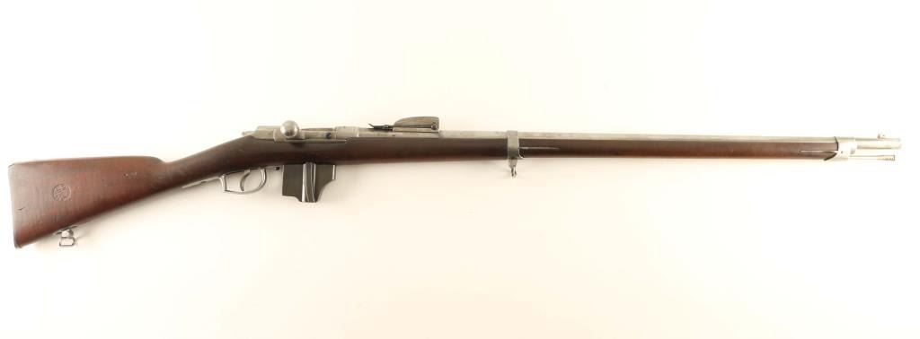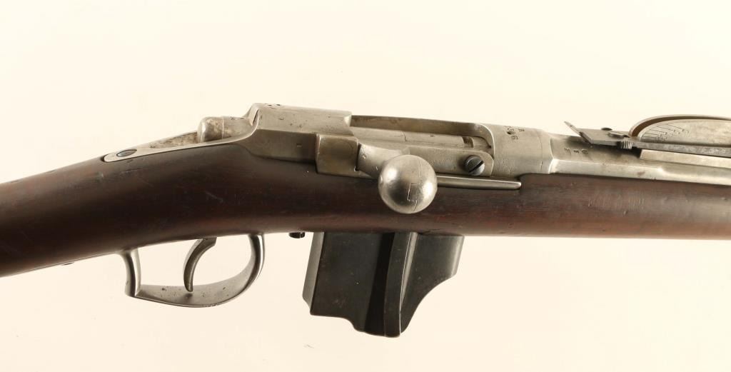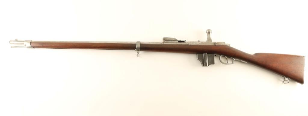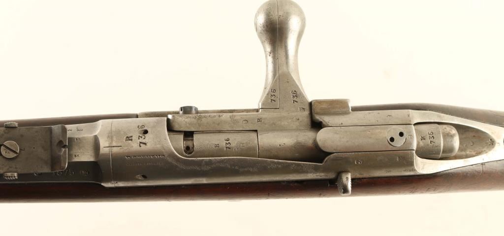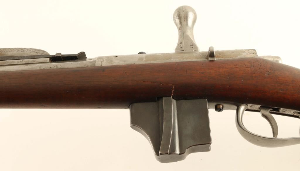 Bolt action military rifle with approx 32" barrel, sling swivels, reproduction cleaning rod under barrel, military sights. Bore is good or better, dark with strong rifling, may clean to very good. Metal is smooth, in the white, lightly cleaned. Areas of light pitting on receiver. Screws appear very good, retain original blue. Blued magazine appears very good. Wood is good condition with many small dents and scratches, moderate crack on left side near magazine, smaller crack on right side. Wood to metal fit is good, bands are a bit loose. Markings include: P Stevens / Maastricht; W crown; 1875 Maastricht cartouche; other proofs. Barrel marked 4297. Condition is NRA Good *** Antique Firearm ***