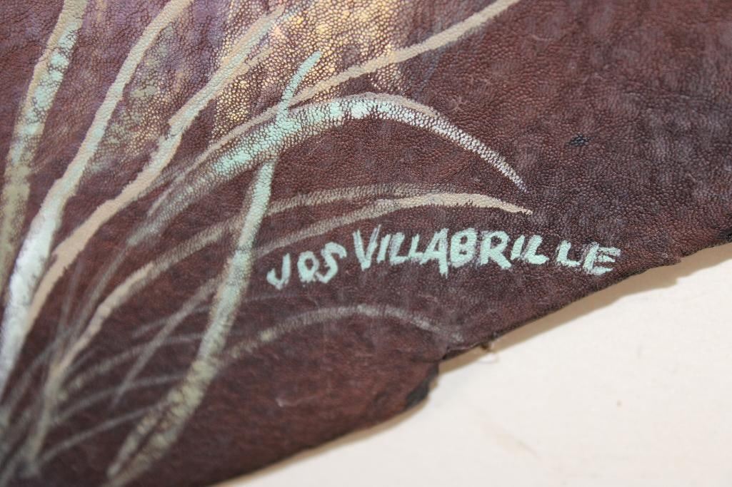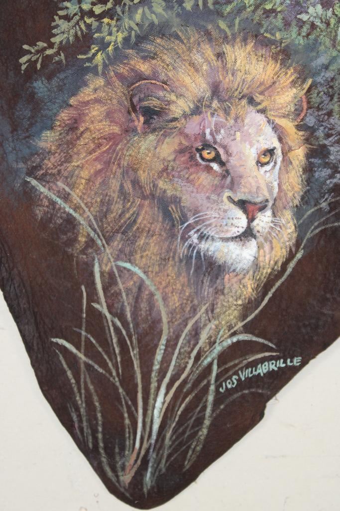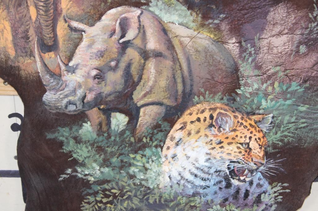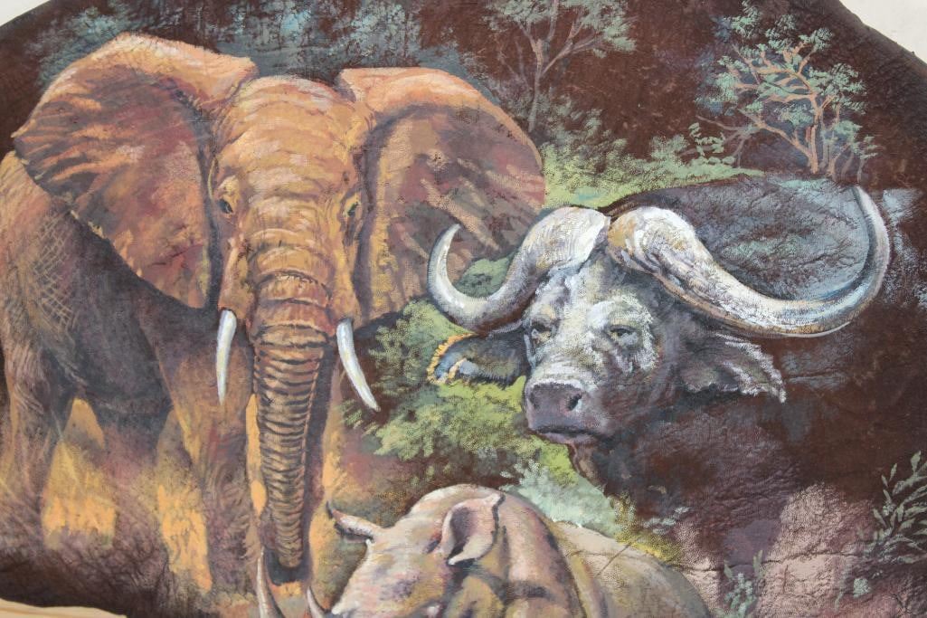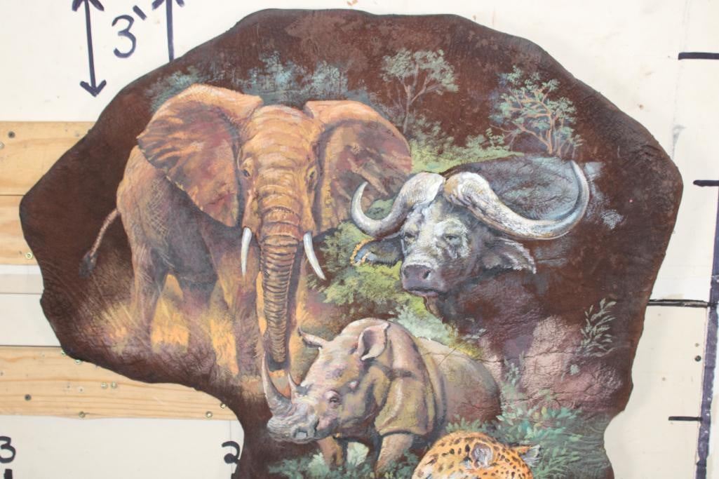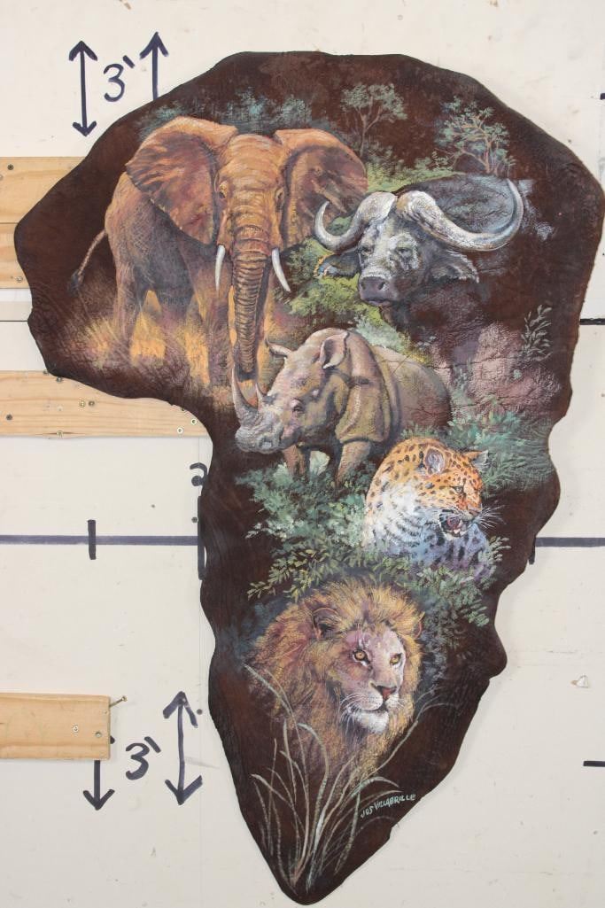 Stunning African "Big 5" Painting on a *Real Skin* ELEPHANT EAR. It has been signed by the artist "Jos Villabrille". It measures 46" Tall x 31.5" Wide and has a wood backing. Jos Villabrille used to make his living painting movie posters on plywood for a cinema in the Philippines. Now his distinct, refined murals cover the walls of homes and businesses all over Tucson, Arizona. COLLECTIBLE AFRICAN TAXIDERMY ART