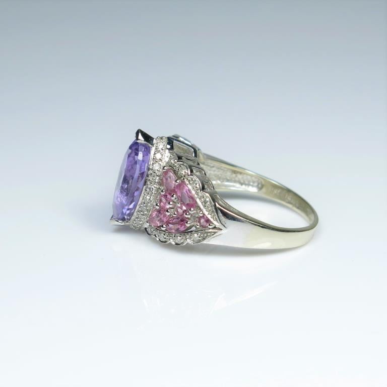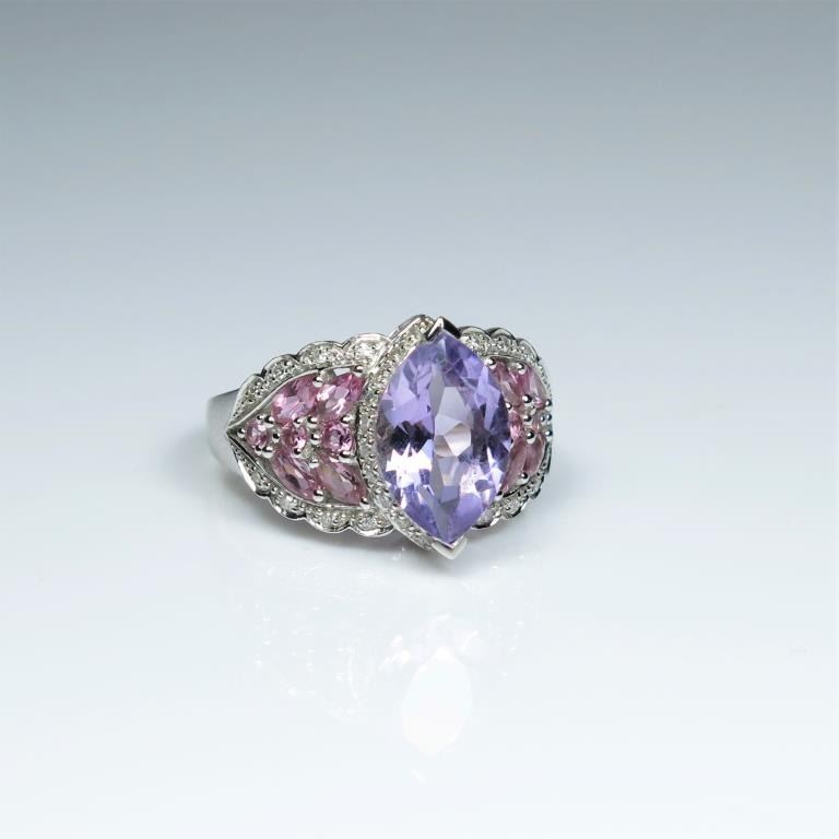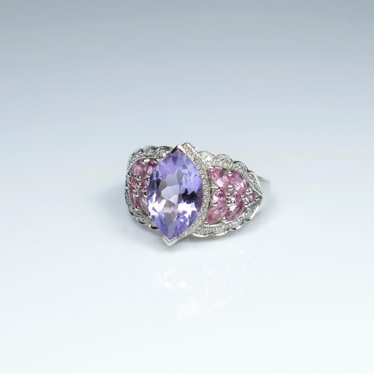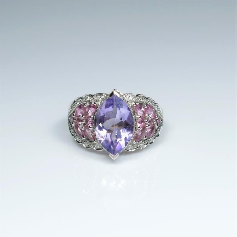 featuring a marquise cut Amethyst weighing approx. 6.00 carats with 14 marquise and round cut Tourmaline accented with 32 Diamonds weighing approx. 0.35 carats set in 14 karat white gold. Retail $2,000-$3,000