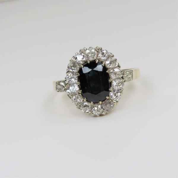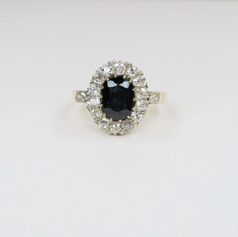 and Diamond Ring featuring an old cushion cut Blue Sapphire weighing 2.55 carats accented by 16 Old Mine Cut Diamonds weighing approx. 1.00 carats set in a two-tone gold original antique setting.