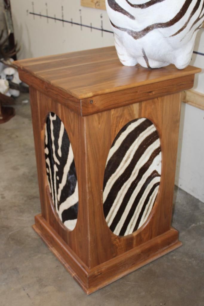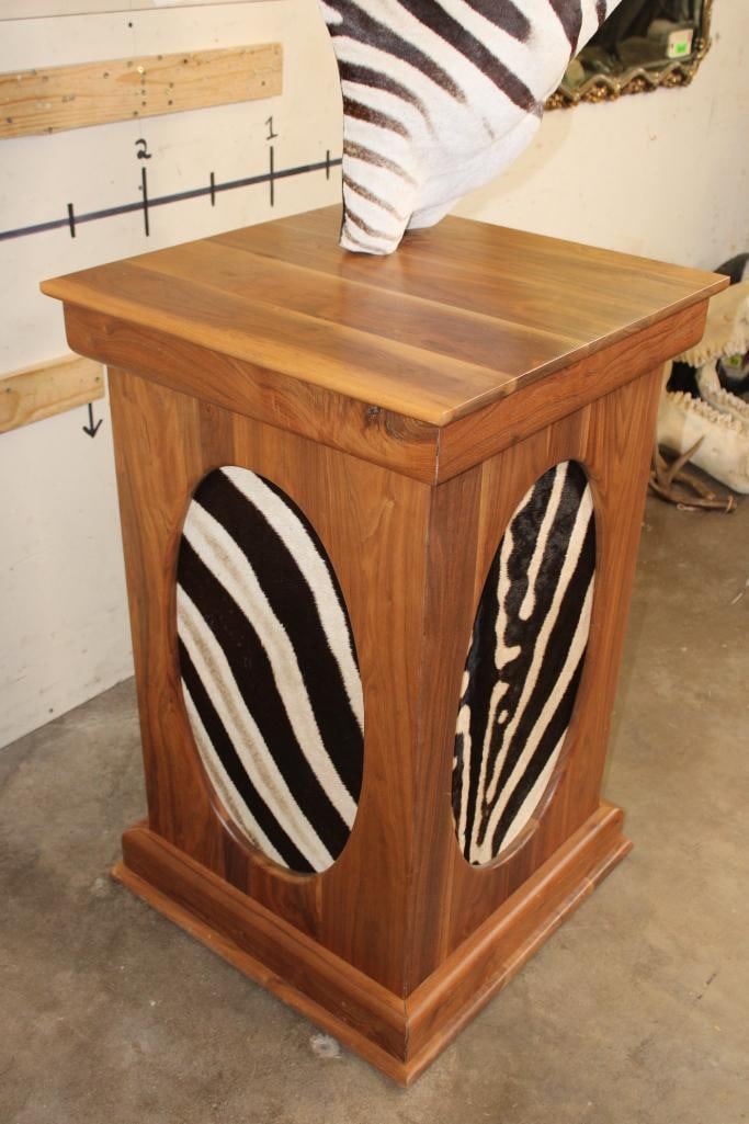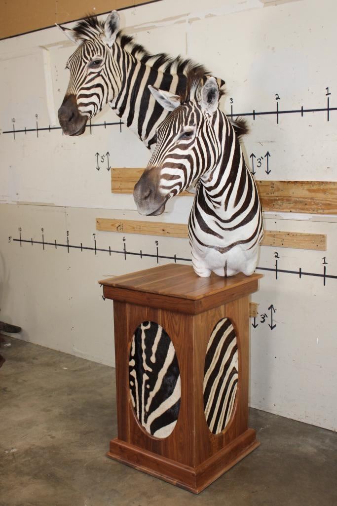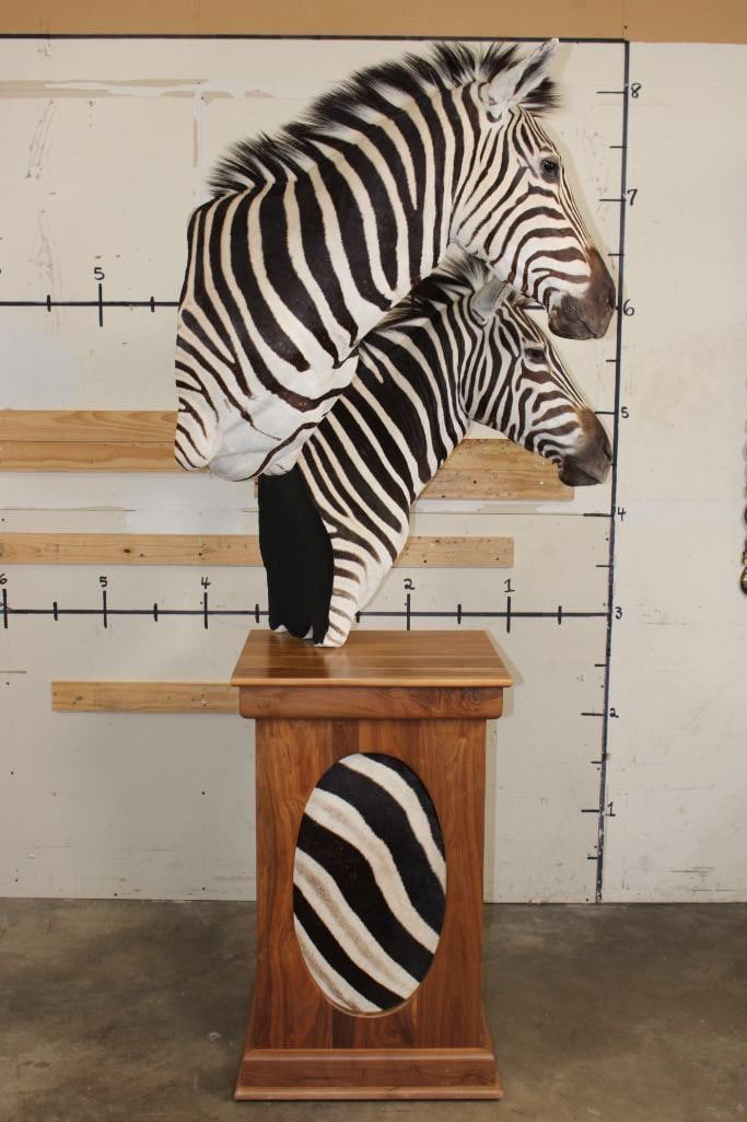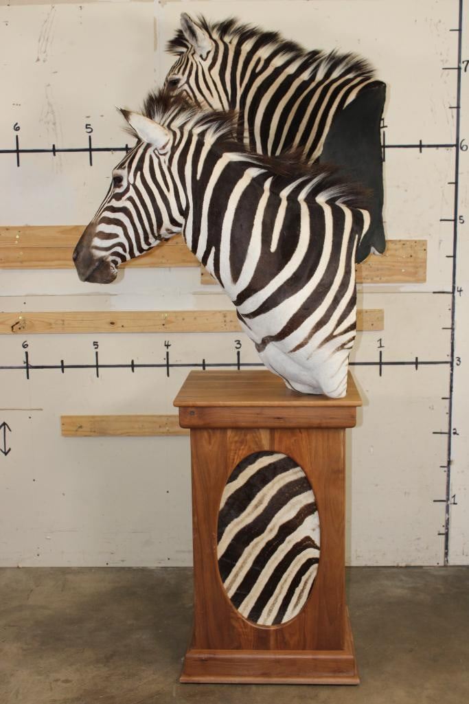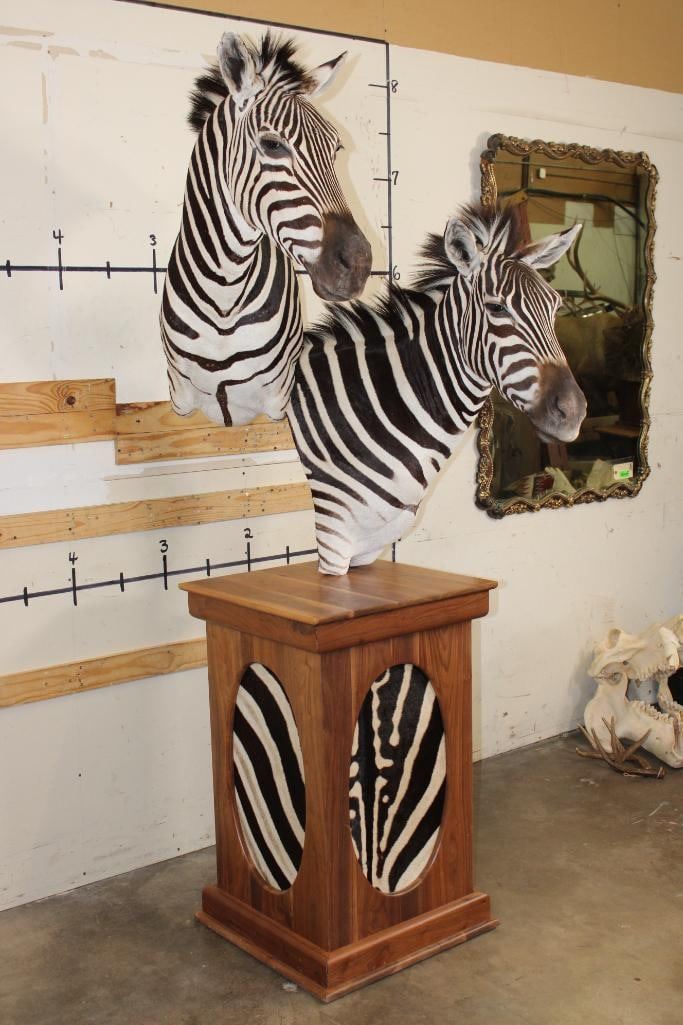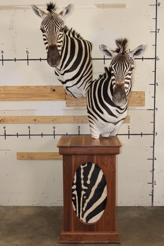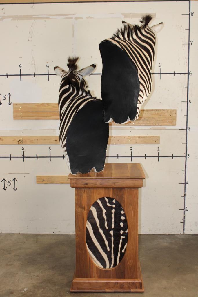 Very Nice, Clean, and Newer Double ZEBRA Pedestal Mount. It looks Brand New! The Pedestal has 4 Panels of Zebra Hide and is made of Wood. The Pedestal measures 24" Long x 24" Wide x 38" Tall. The Zebras are Removable. The Total Mount Height is 7' 6" Tall. This mount is in Very Good Condition. TAXIDERMY *This item was sold in our last auction. The buyer did not pay, it is being resold*.