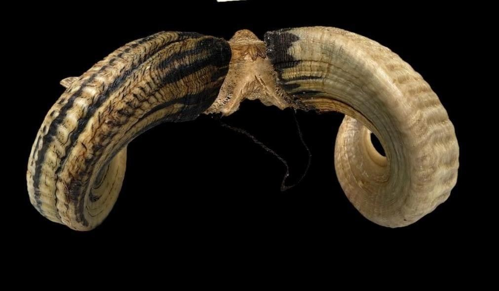 Expertly hand-carved and crafted Indonesian GARUT SHEEP/RAM Skull. Depicted on the Skull are a large Native American/Indian, Eagles, Bears, and a Wolf. The Horns have a 22" Spread and measure 29" long (each) and 12" around the Horn Base. COLLECTIBLE TAXIDERMY ART