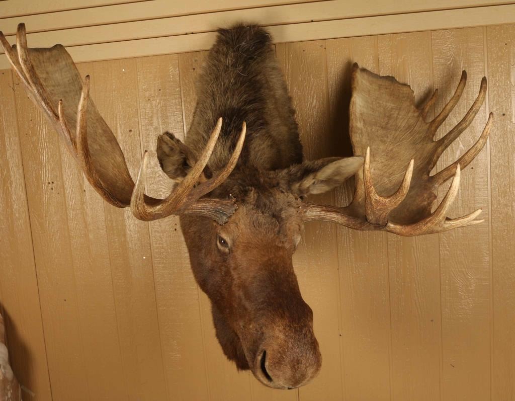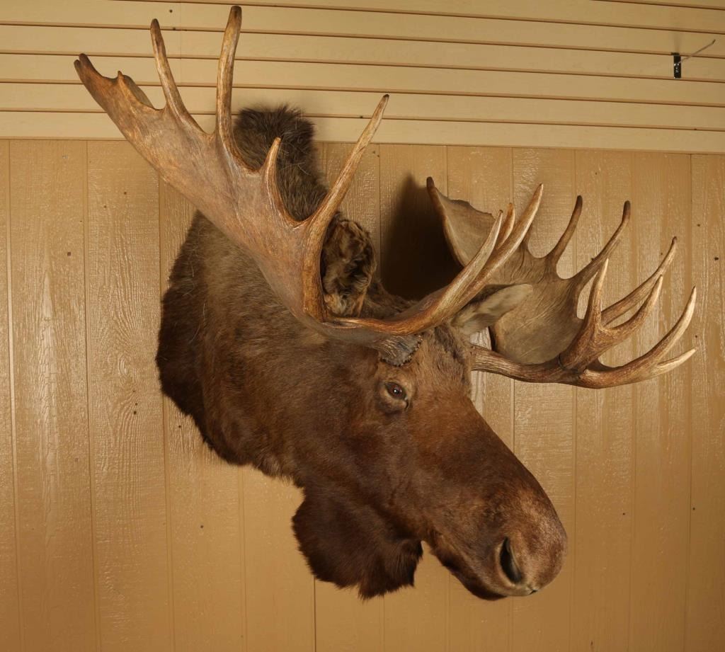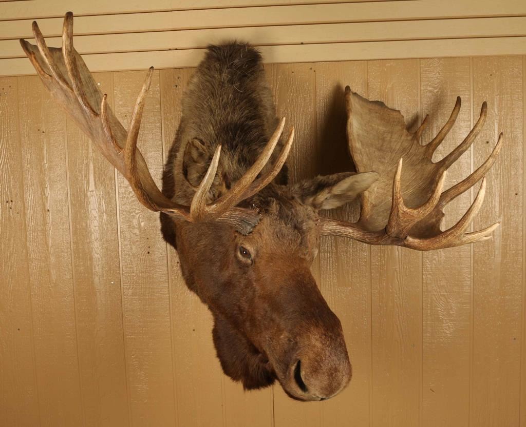This large, excellent condition Moose shoulder mount has a removable 56" rack and has 18 points overall.
