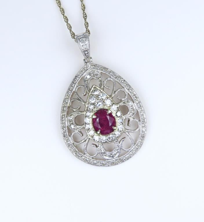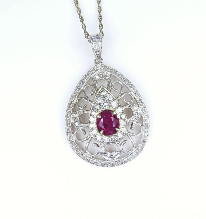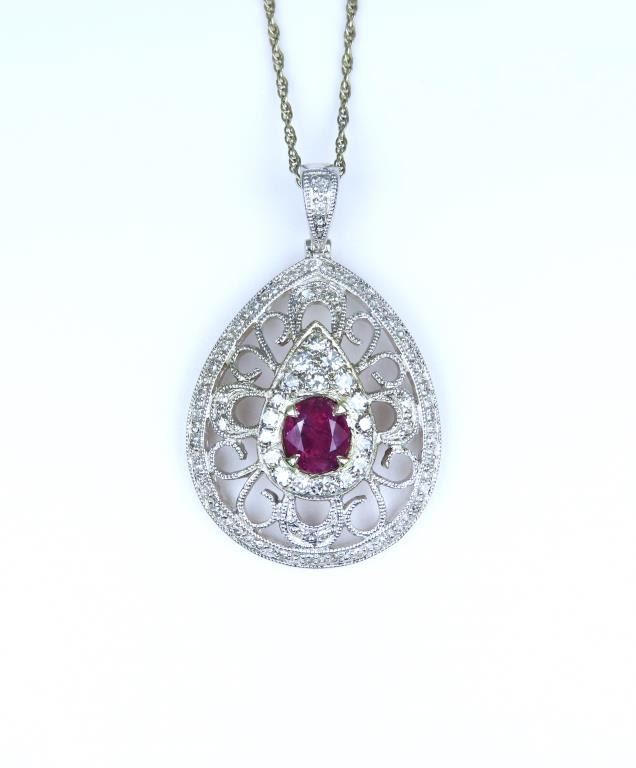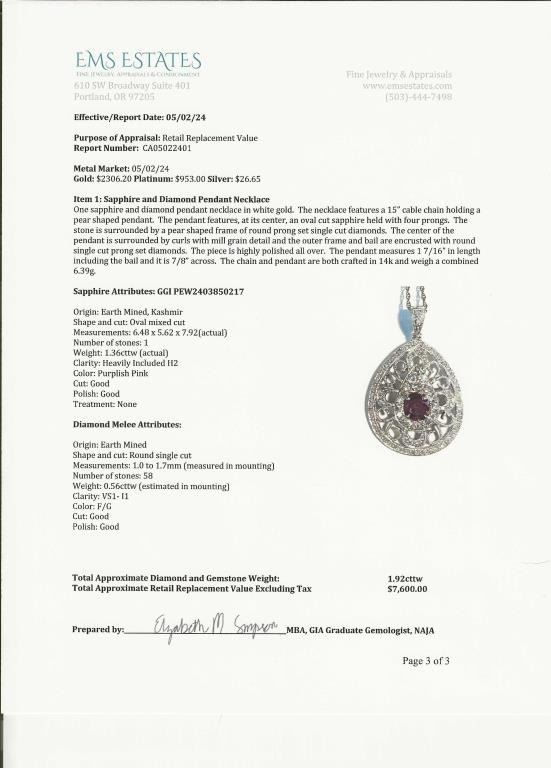 and Diamond Pendant featuring a G.G.I. Certified natural, No Heat or Treatment Sapphire weighing 1.36 carats accented with 58 round cut Diamonds weighing approx. 0.56 carats with F-G colors and VS clarity. Set in an intricately detailed Art Deco style setting crafted in 14 karat white gold. Full Appraised Retail Value - $7,600.00