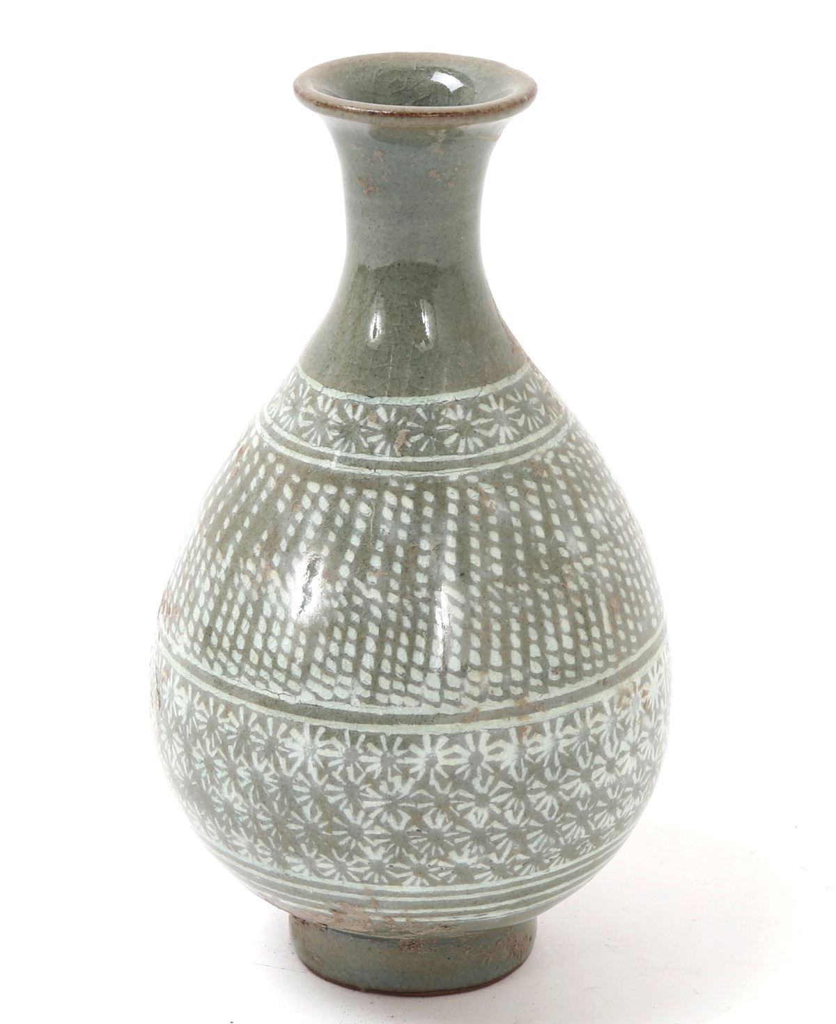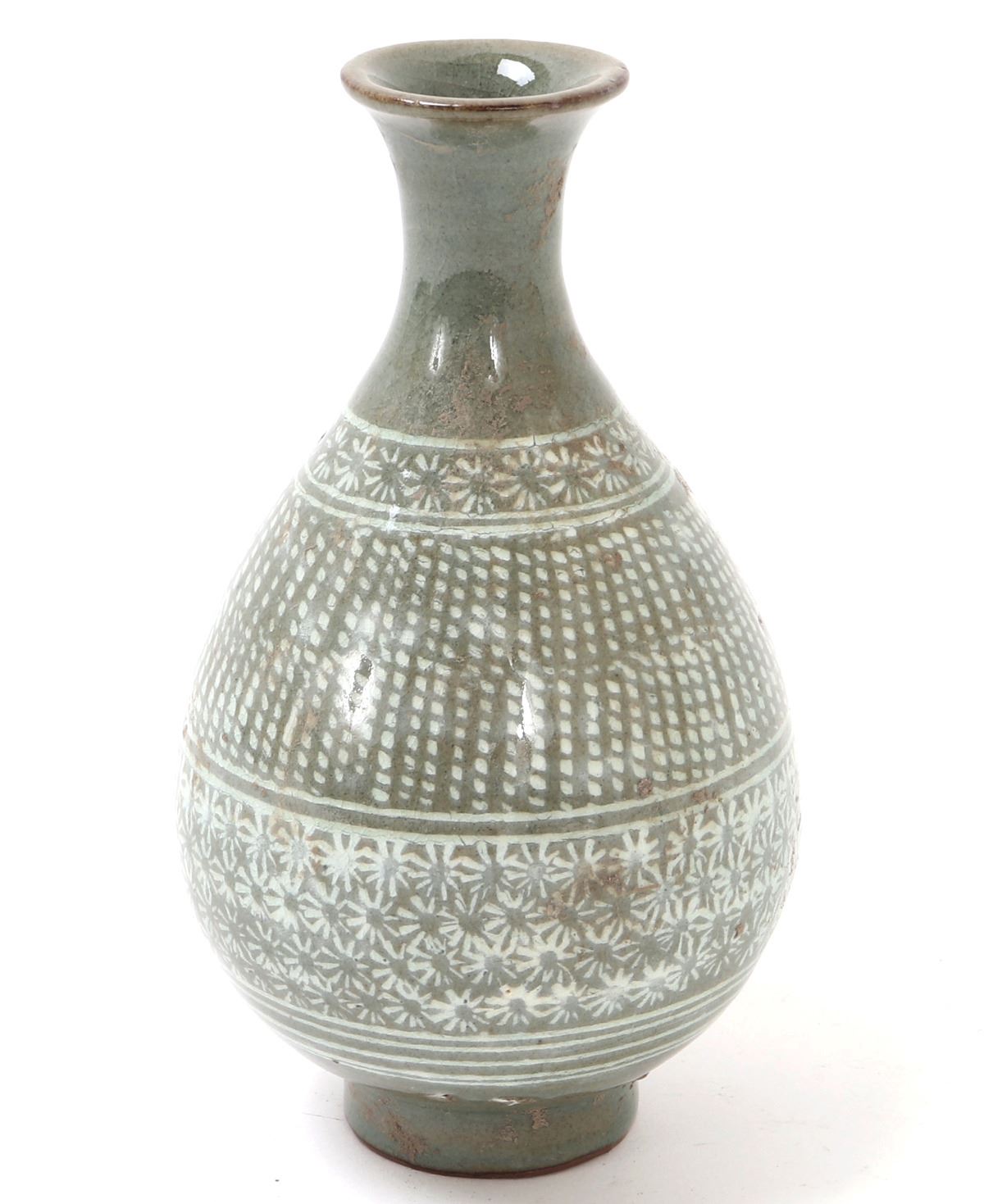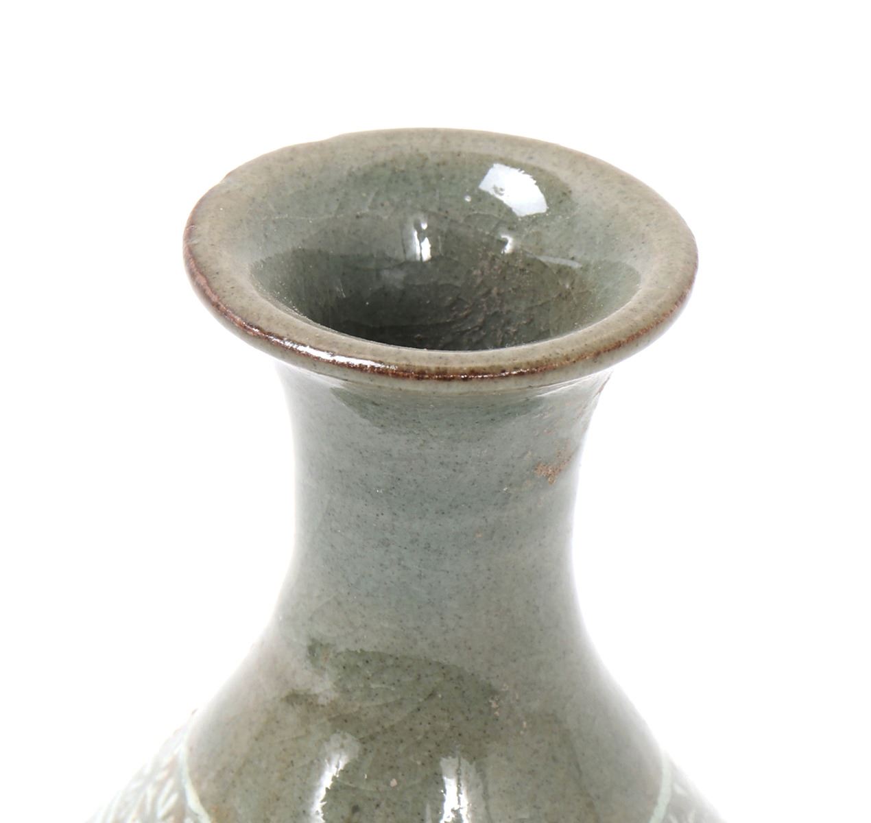 Early Korean ceramic green celadon crackle glazed pear shaped vase. Expertly detailed in a white paint making the piece look incised. Lovely band of blooming flowers to the neck as well as around the lower body section of the vase. Slightly raised pedestal foot with a corseted neck with a flared opening. Size 6" H x 3 1/4" W. Condition: Good overall condition throughout.