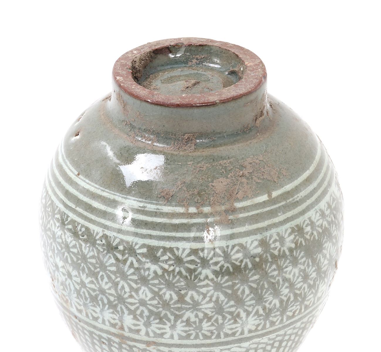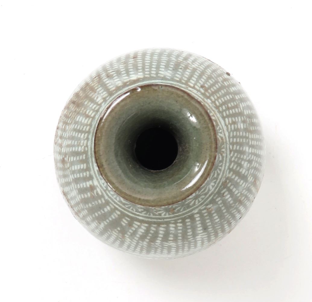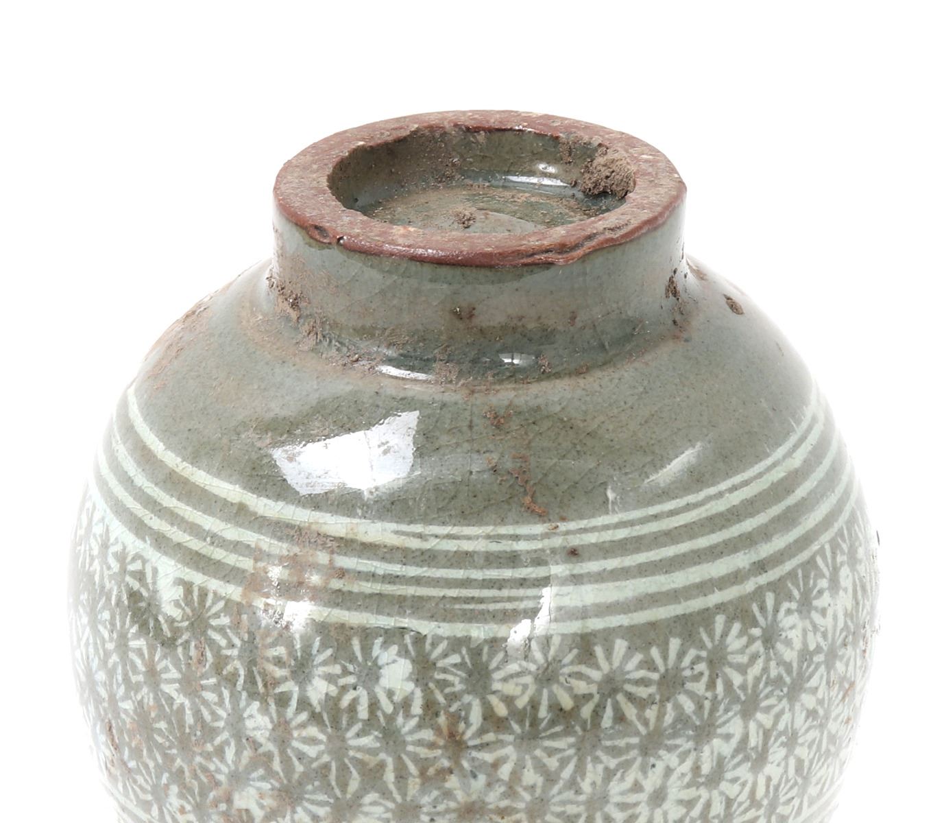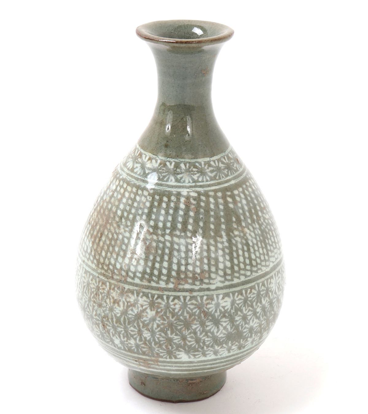 Early Korean ceramic green celadon crackle glazed pear shaped vase. Expertly detailed in a white paint making the piece look incised. Lovely band of blooming flowers to the neck as well as around the lower body section of the vase. Slightly raised pedestal foot with a corseted neck with a flared opening. Size 6" H x 3 1/4" W. Condition: Good overall condition throughout.