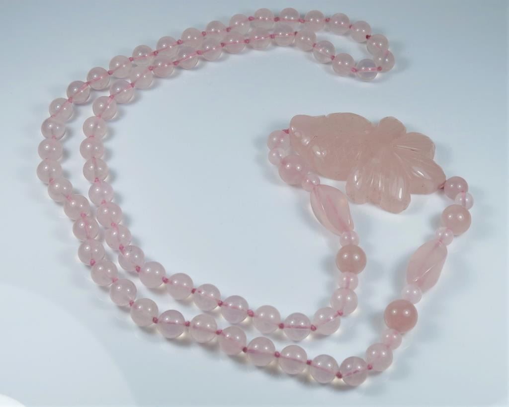 featuring artistically carved fish measuring 2.25 x 1.50 inches accented with 30 inches of Pink Quartz beads, one of a kind piece.