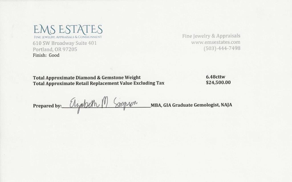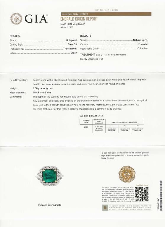 Green color weighing 4.36 carats with 50 round and marquise cut Diamonds weighing approx. 2.12 carats with G-H colors and VS clarity, set in an 18 karat white and yellow gold custom crafted setting, ring size 7. Full Retail Appraisal - $24,500.00.