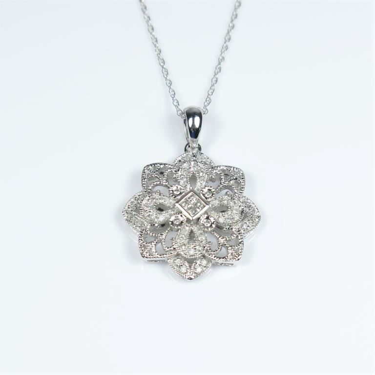 featuring 4 Princess cut Diamonds accented with 40 micro set Diamonds weighing approx. 0.50 carats with G-H colors and SI clarity set in highly detailed flower design crafted in 14 karat white gold. Retail $2,000-$3,000