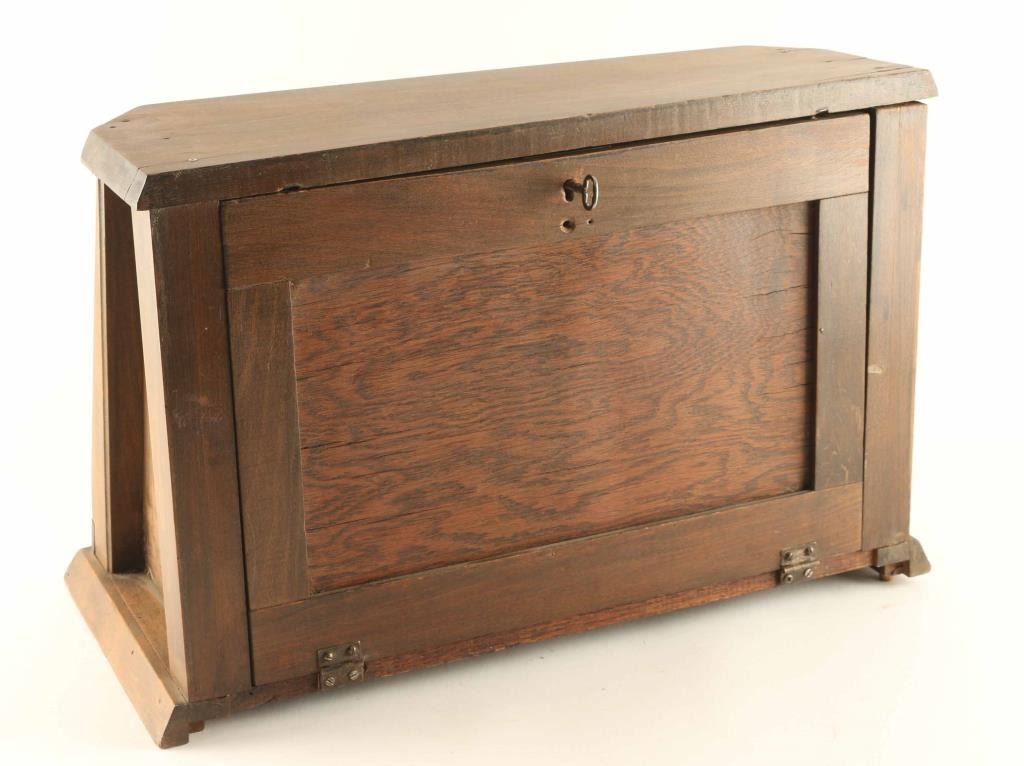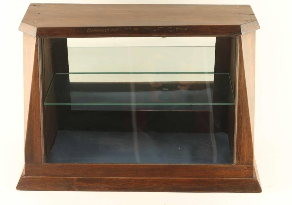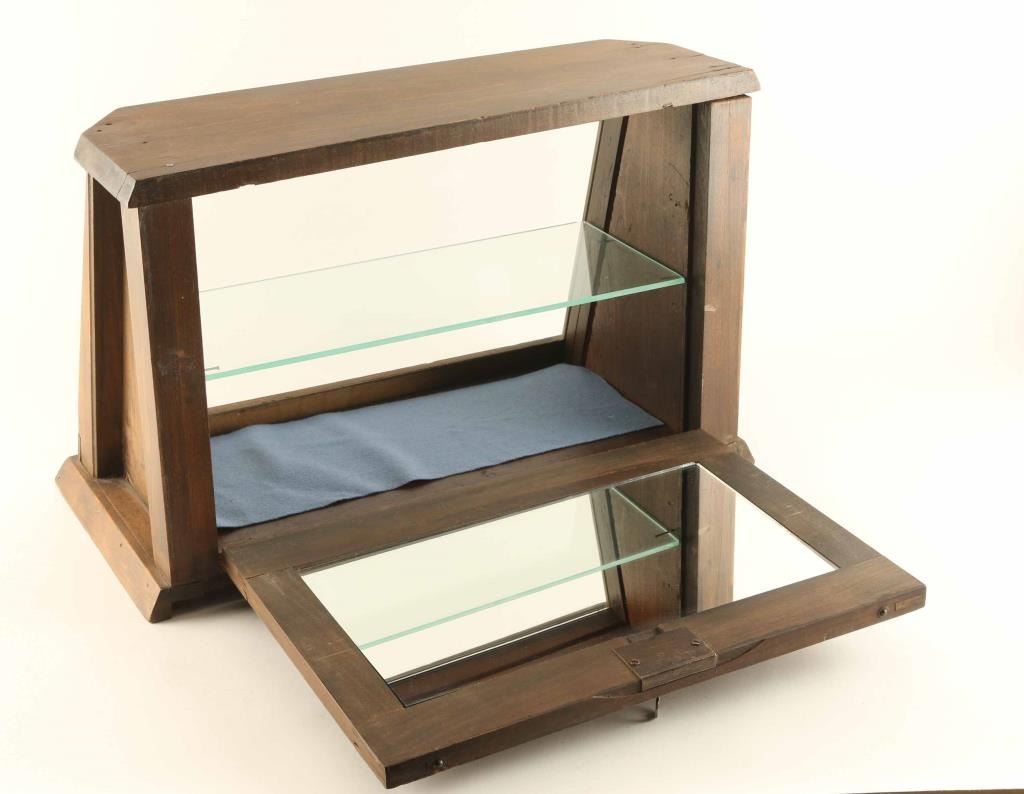 Includes a dark colored wooden display case with mirrored back and glass shelving. Includes key to open the flip down drawer style back. Measures 19x 9 1/2" x 13".