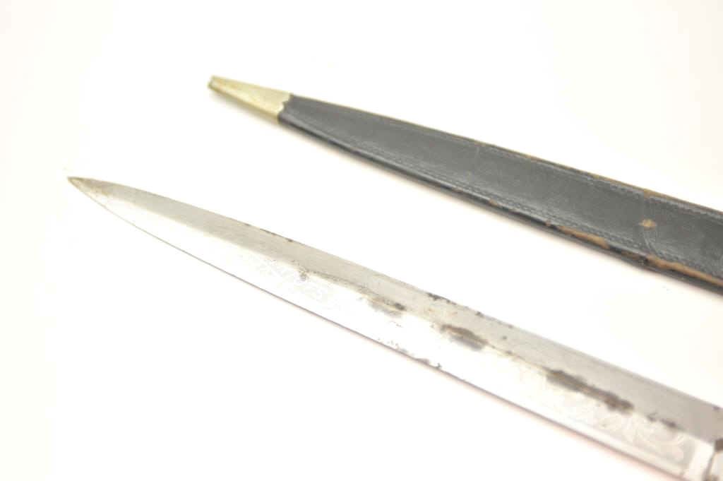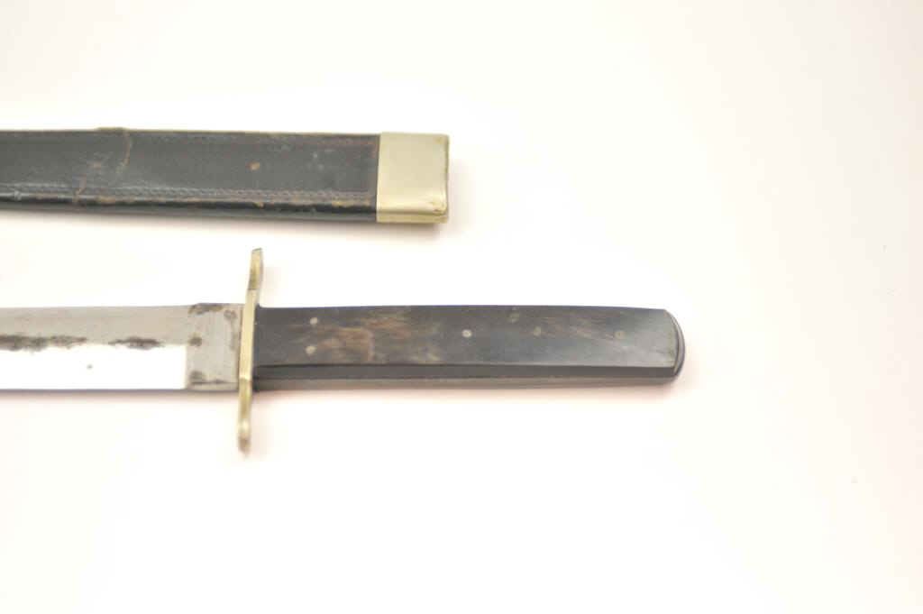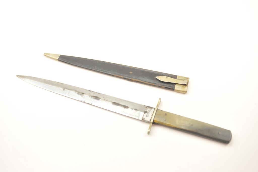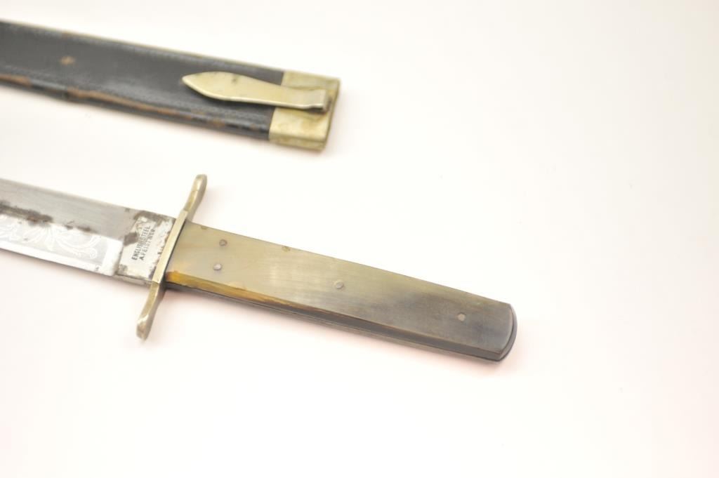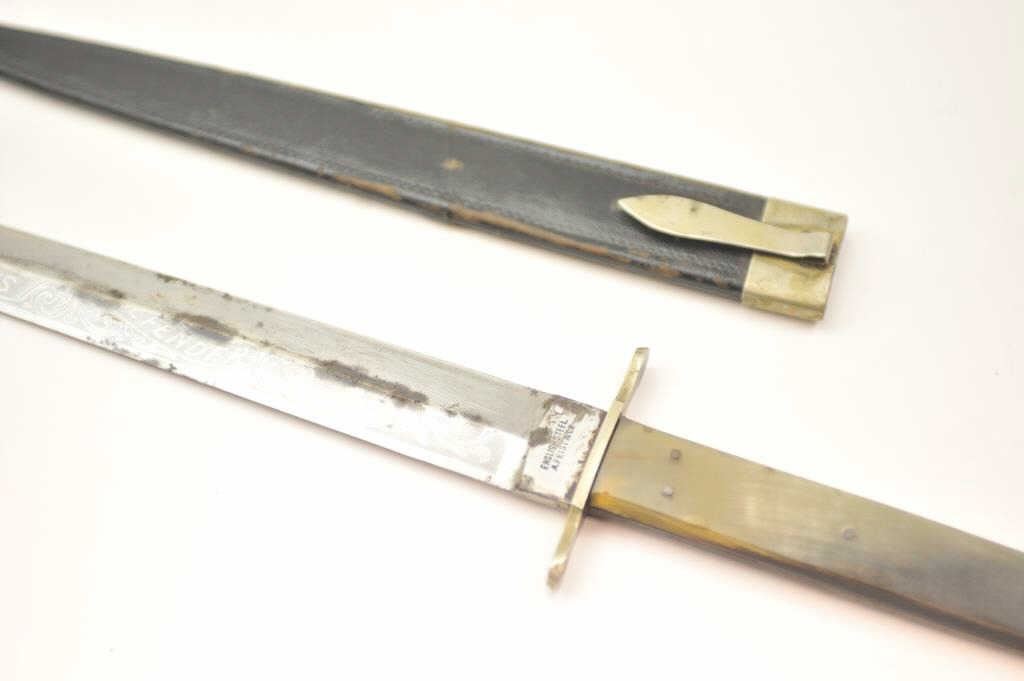 Beautiful custom knife by Jim Moyer of Idaho City, Idaho. The Birdseye Damascus steel Bowie and custom sheath is in excellent condition with an overall length of 15”, the clip point blade is ¼” thick and 6 1/8” inlength. The process to produce the Birdseye Damascus steel involves 20 layers of two types of steel and a significant number of man hours. The grip is constructed of Mule deer antler crown with brass handguard,stacked leather and red spacers. The hand tooled leather sheath is also in excellent condition. Our consignor won the knife in the Shoot! magazine, 5th annual Cowboy benefit raffle in 2006. The lot includes all correspondence with the builder, including a letter where he tells the consignor the knife would retail for $1,200.00 and a copy of the May/June 2006 Shoot! Magazine with an article titled, “Moyer Knives” chroniclingthe knife’s construction. Est.: $600-$1,200.