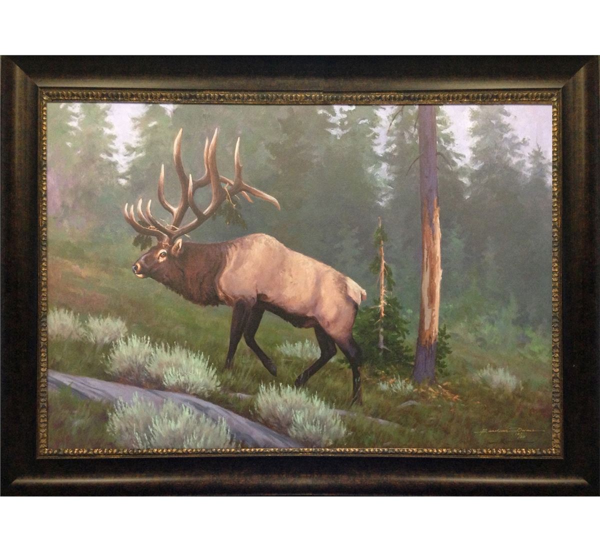 The aftermath of a big bull preparing for the rut can be exhilarating. Finding these haunts poses many questions....how long has it been since he was here...how big of a bull is he...is he bedded just beyond that tree line or is he long gone. Which ever it is this place will forever be in our mind and will always deserve another look... Randsom has been painting professionally for over 20 years and is very well known for his depictions of mule deer and elk throughout the west. This is an exceptional piece of art to enhance your private collection and help fund big game conservation.