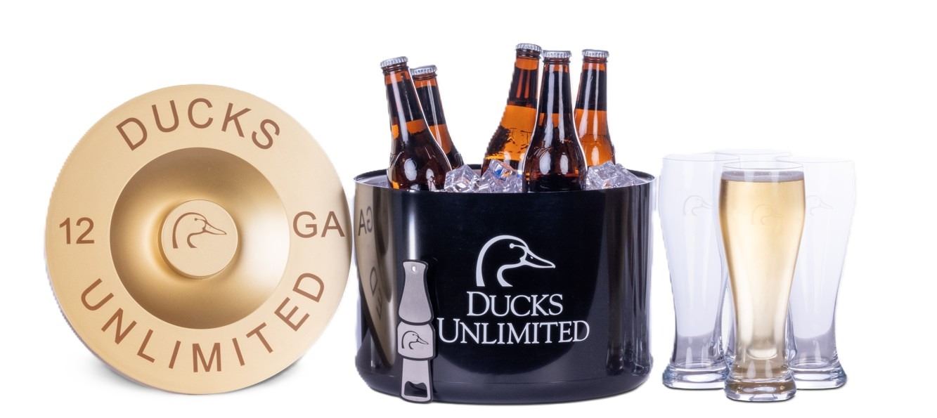 Beer lovers and outdoor enthusiasts alike will appreciate this unique set, complete with an ice bucket, four pilsner glasses, and a duck call–shaped bottle opener. The standout ice bucket is designed to resemble a black shotgun shell, accented with a gold top and the Ducks Unlimited logo in white. Each pilsner glass is finely etched with the DU logo, making the collection both practical for entertaining and distinctive for display.