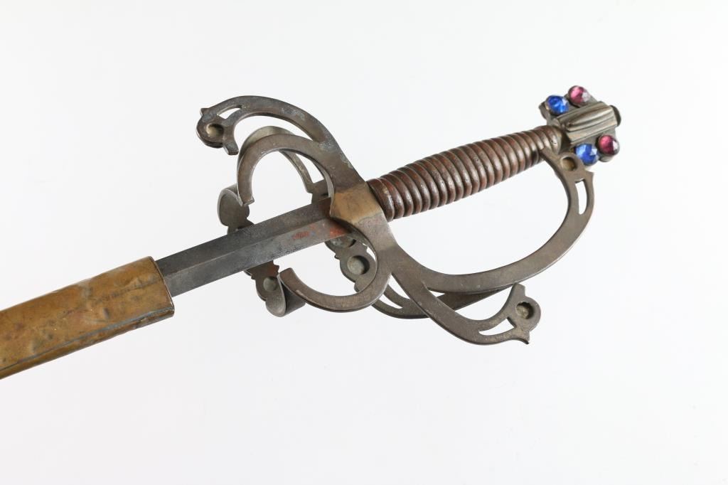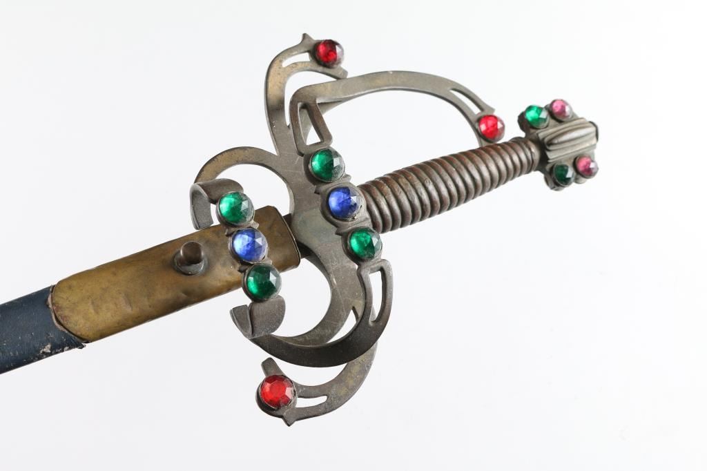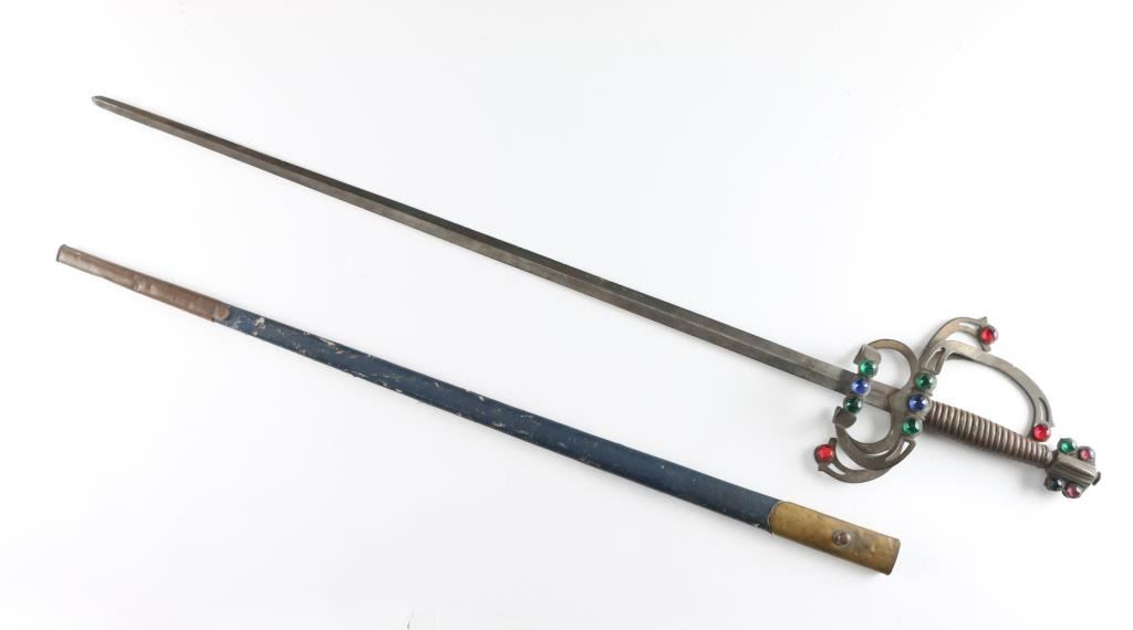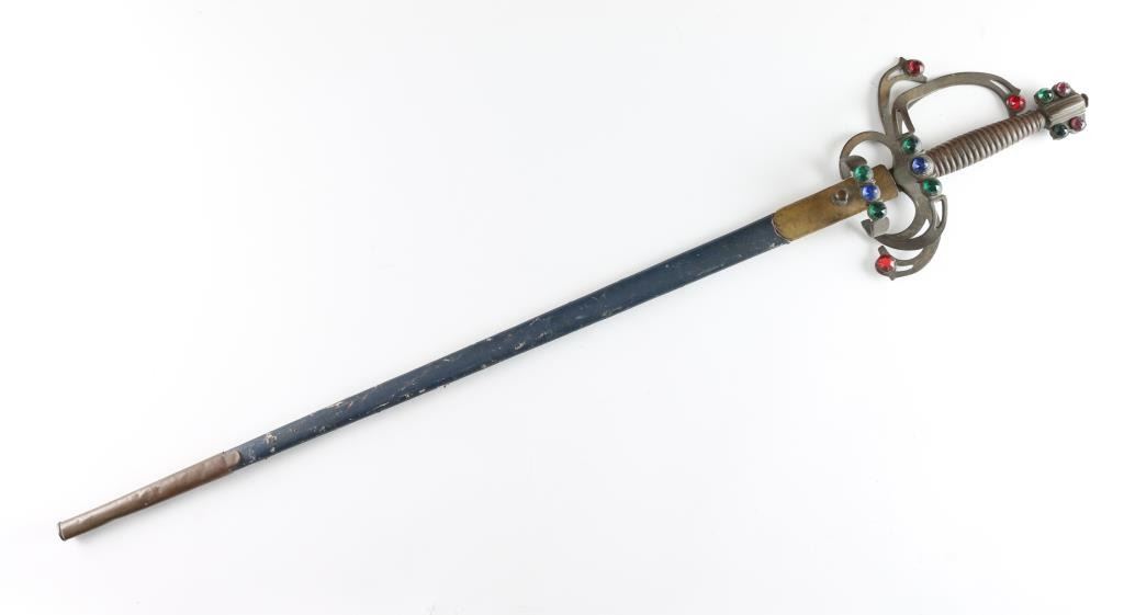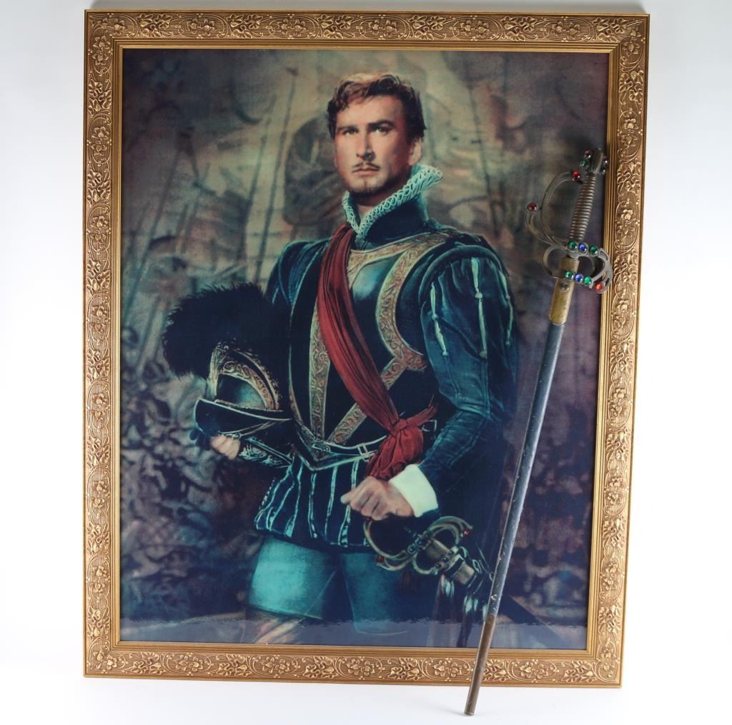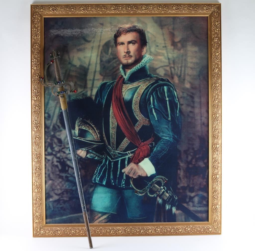 Used by Errol Flynn in an Epic Golden Age production film of "The Private Lives of Elizabeth and Essex". Includes blue scabbard. Obtained from Michael Zomber who purchased it from Western Costume Company sometime after the movie was released. Both Rapier and scabbard are in very good condition. Identified from stills by Joseph Musso. Image dimensions: 40" x 32". Image is nicely framed and in fine condition. From the Joseph Musso Collection