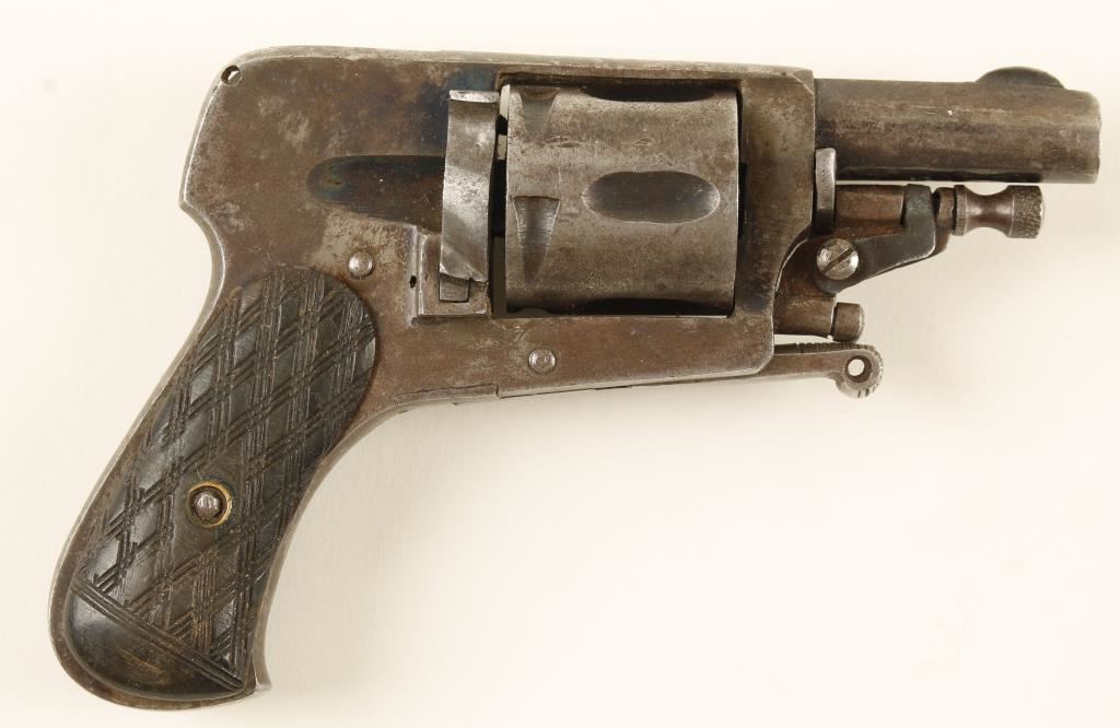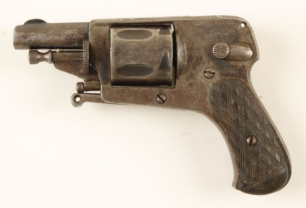 Blued hammerless double-action only 5-shot folding trigger revolver with a safety and a 1-9/16" barrel. Metal finish is worn with little bluing left and much evidence of past surface rust. The grips are ill-fitting and may not be original. Action is frozen and will not function. Bore has rifling and pitting. Chambers have pitting. May be missing cover plate for hammer. Condition is poor. *Modern Firearm*