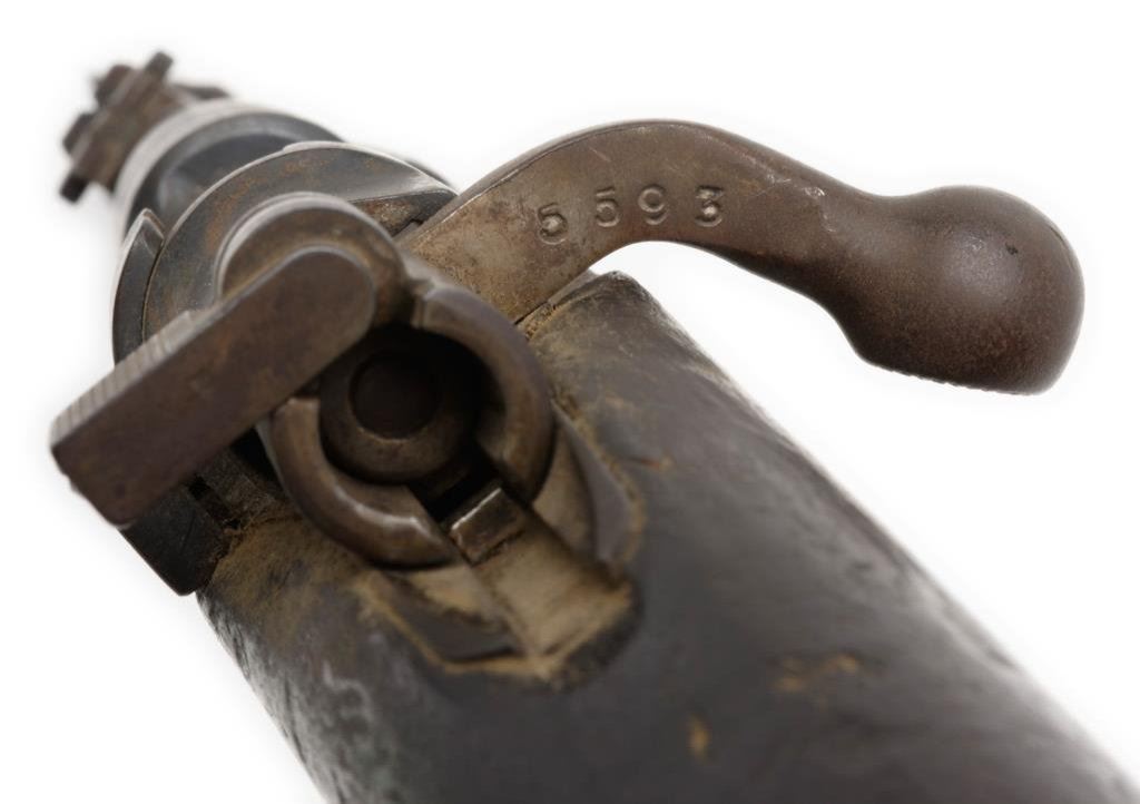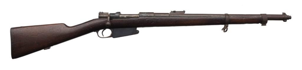 Belgian Fabrique Nationale bolt action carbine, 7.92mm caliber, 22” barrel, S/N E 5593, military finish, wood stock, bayonet lug on bottom of front barrel band. This gun is in overall good condition showing a dark uncleaned brown patina mixed with military blue in protected areas. Matching visible numbers except magazine. Good bore, crisp action and good markings. Stock is overall good with scattered general old mars and dings from carry and storage. Est.: $200-$400.