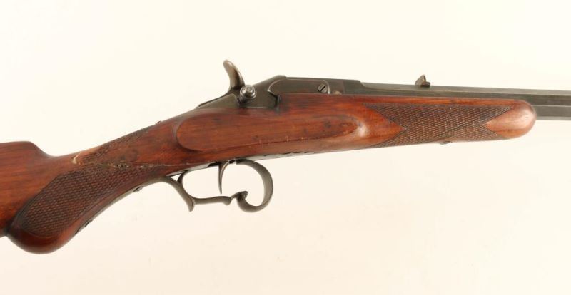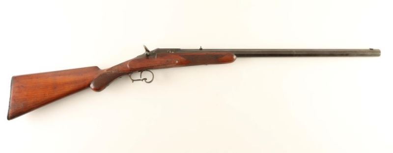 Antique Belgium made single shot parlor rifle chambered for 8mm Flobert, circa 1850's-1890's. Features a blued 24.5" octagonal barrel with a geometric gold inlayed design near the breech, dovetailed open sights, case hardened receiver with Warnant system action, smooth trigger, knurled hammer spur, fancy triggerguard, and checkered pistol grip shoulder stock with fancy hard rubber buttplate. The finish on the barrel has drifted to an aged brown patina and nice case colors are present under the breech block on the receiver. Action performs well, bore appears excellent and the wood stock is fair with cracks & repairs. Condition is NRA good. ***Antique Firearm***