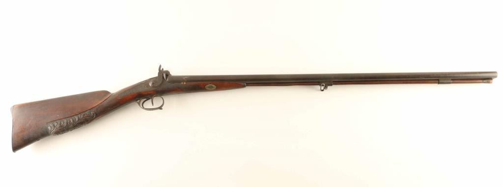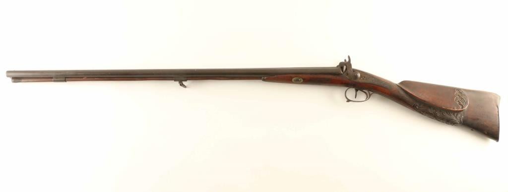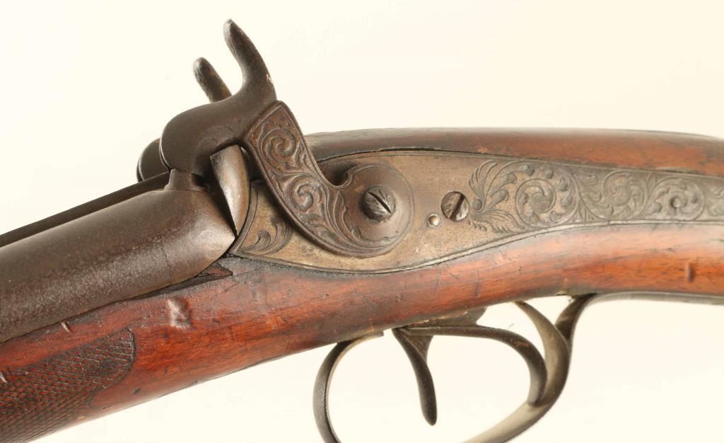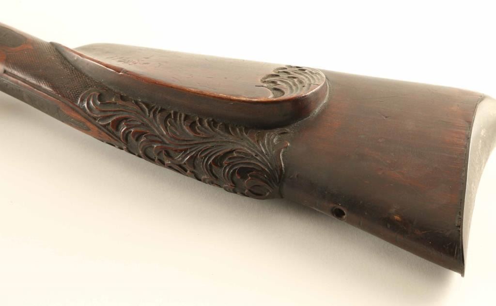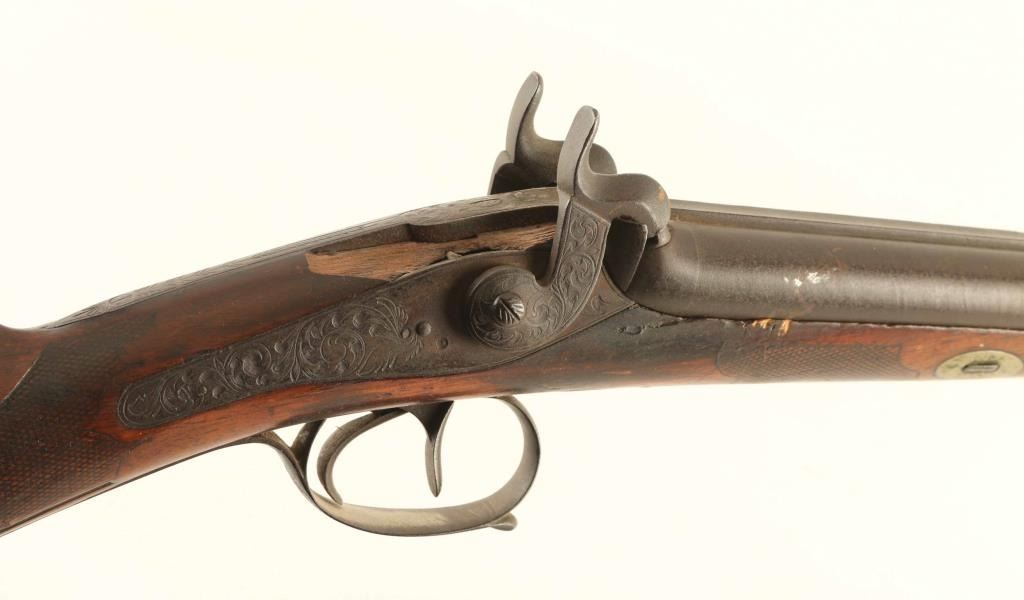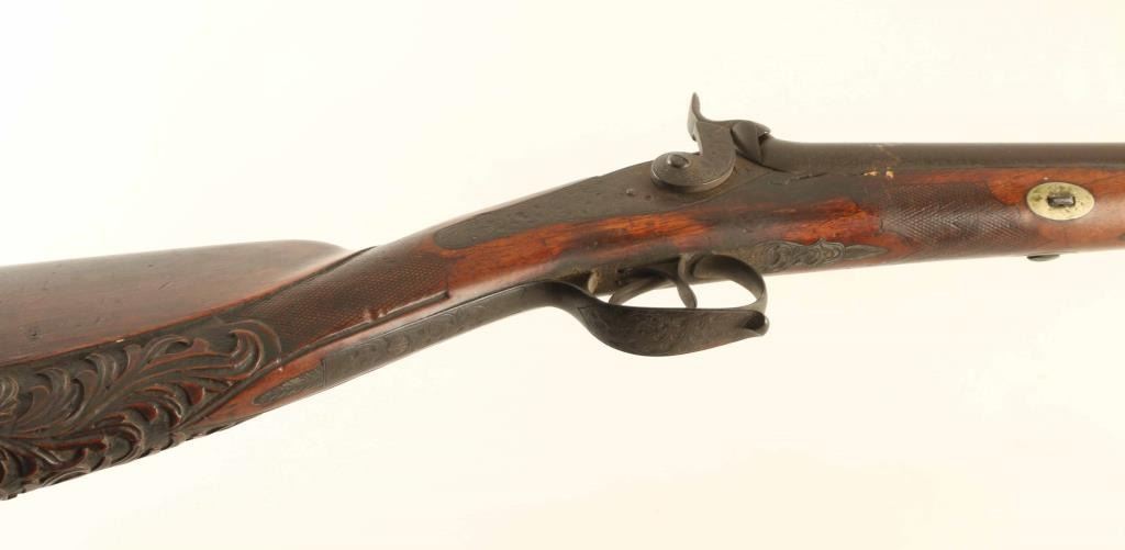 Shotgun. Vintage percussion side-by-side. Exposed Hammers lock up tight. Double triggers. Floral carved stock, with cheek rest. Missing rear sling swivel. Metal finish has turned a dark brown patina. Original wooden ramrod. Bores appear dark/dusty. Stock has numerous minor scratches, dings, and chips along the fore-arm. There is a 3" chip out of the wood above the right lock-plate. NRA Condition-Fair-Good. Antique Firearm.