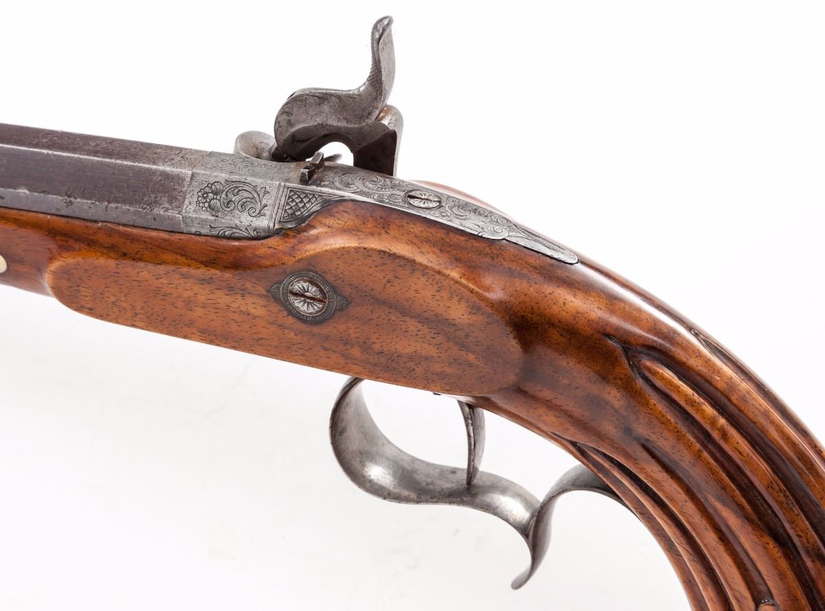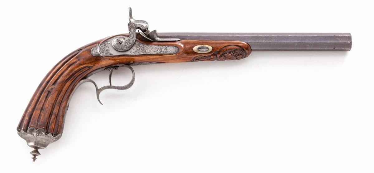 Belgian Single Shot Percussion Target Pistol, NVSN, approx. .50 cal., 9'' octagonal barrel, fluted walnut stock, finely engraved lockplate, hammer, upper tang, triggerguard and pommel cap. Condition is fine as partially refinished. Barrel retains approx. 80% original factory blue/brown, missing front sight blade. Stock has been lightly refinished and shows well. Good functioning action, very good bore. Est.: $500-$750. (Antique)