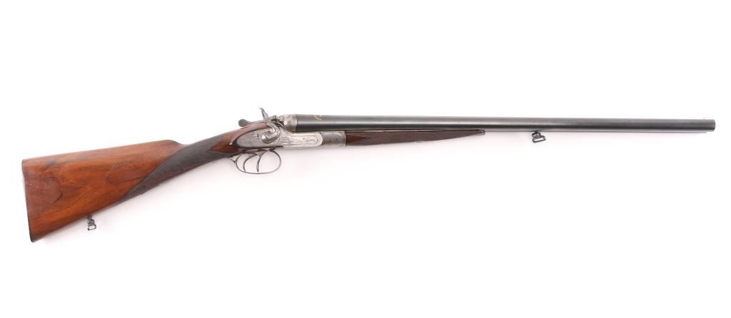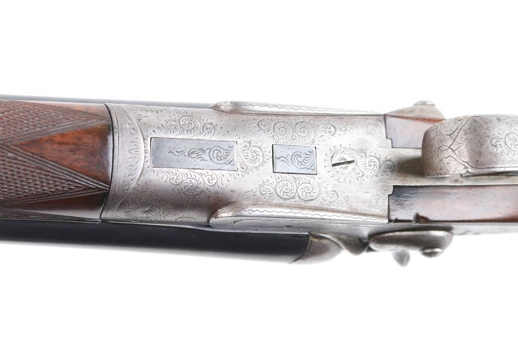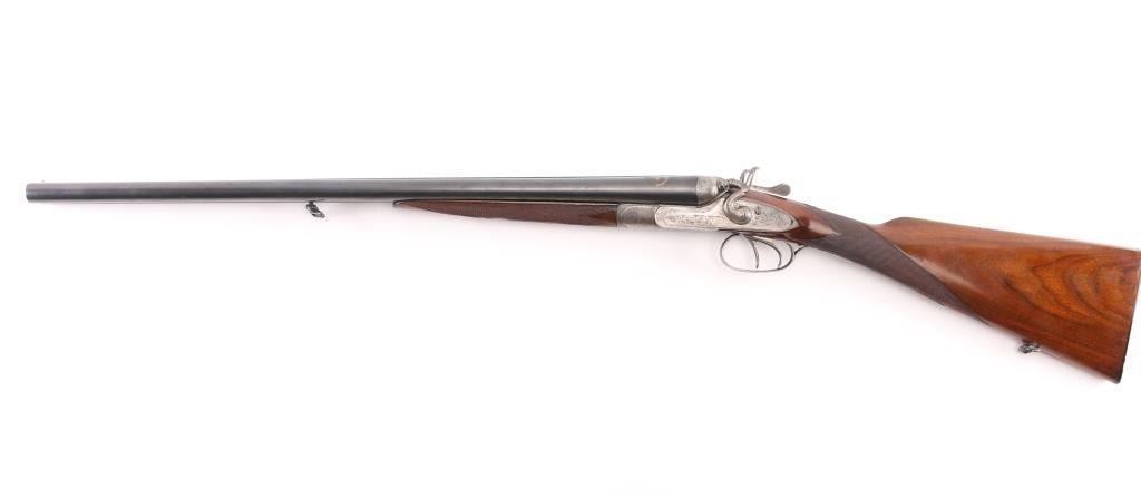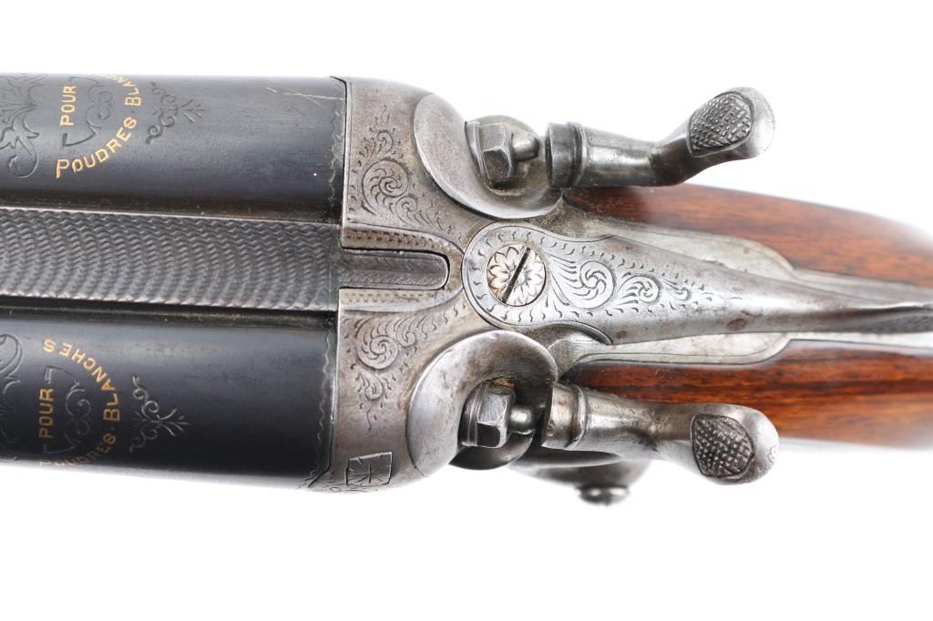 Here is a very finely made, 16 gauge, side by side double, with highly engraved and case hardened side locks and exposed 'Rabbit Ear" hammers. Greener cross bolt. Barrel rib marked "Acier Extra Fine", and on both barrel "Pour Poudres Blanches" highlighted in gold. 24" barrels choked IC, & CYL, LOP is 14" Walnut stocks have fine checkering on the wrist, & forearm, action has floral/scroll engraving with rabbits on side, and fox hunting water fowl on the other. Although not marked as such, the shot, and engraving is done in the style of artisans Raick Freres established in Liege, Belgium in 1807 and were in business as late as 1965. They were know for their high grade custom rifles and shotguns. rebounding hammers, and spring loaded firing pins. The bores are overall good/bright with some light pitting above the chambers. Double trigger. Action is smooth, barrels lock-up tight, wood is very good, minor scratches, sling swivels attached. Serial number matched on water table, and barrels. NRA Condition-Good. C&R Firearm.