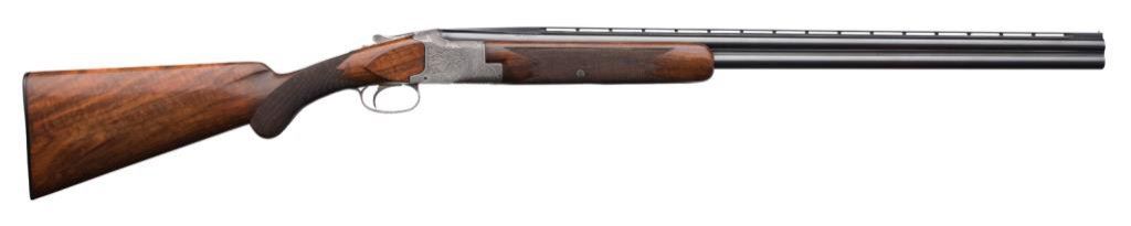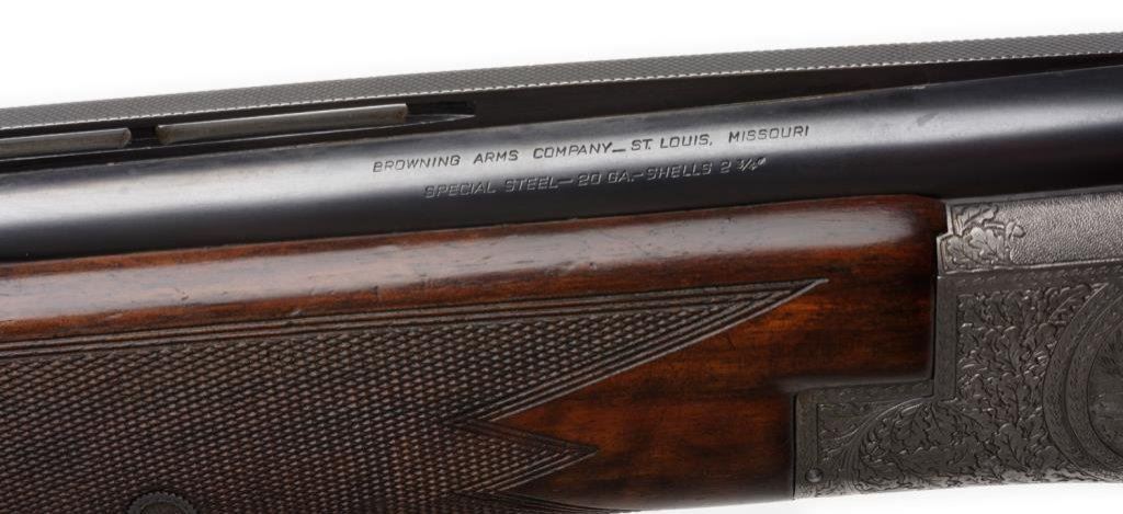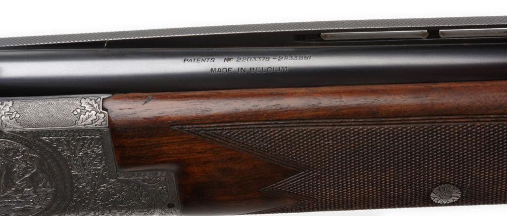 Belgian-made Browning Diana Grade O/U shotgun, 20 gauge, 2-3/4” chambers, 28” ventilated rib barrels, S/N 4324, blued finish to barrels, high relief engraved receiver with panel game scenes on all three sides and also on the bottom of the trigger guard; single select gold trigger, auto ejectors, deluxe checkered wood stocks with correct Browning black butt plate. This very desirable early Browning shotgun is in overall fine condition displaying the majority of its original finish, fine bores, crisp actions, sharp engraving and markings; overall fine wood stocks with minor high point wear to finish and some scattered light mars and scratches from carry and storage. Est.: $4,000-$8,000.