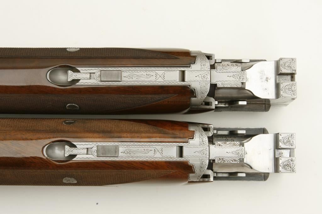 Belgian made Browning Pigeon Grade two O/U barrel set, long tang, 12 gauge, 28” Broadway rib barrels, Full-Modified and Skeet-Skeet choked, single gold trigger, blued barrels, engraved bright receiver, deluxe checkeredwood stocks with round knob pistol grip, L.O.P. is 13.25” to end of wood and 14” to end of hard rubber butt pad, S/N 50464S6, in overall excellent to like new condition with “LWK” engraved plaque on underside of buttstock. Accompanied by a Browning lined leather suitcase style hard case. (Modern). Est.: $4,000-$8,000.