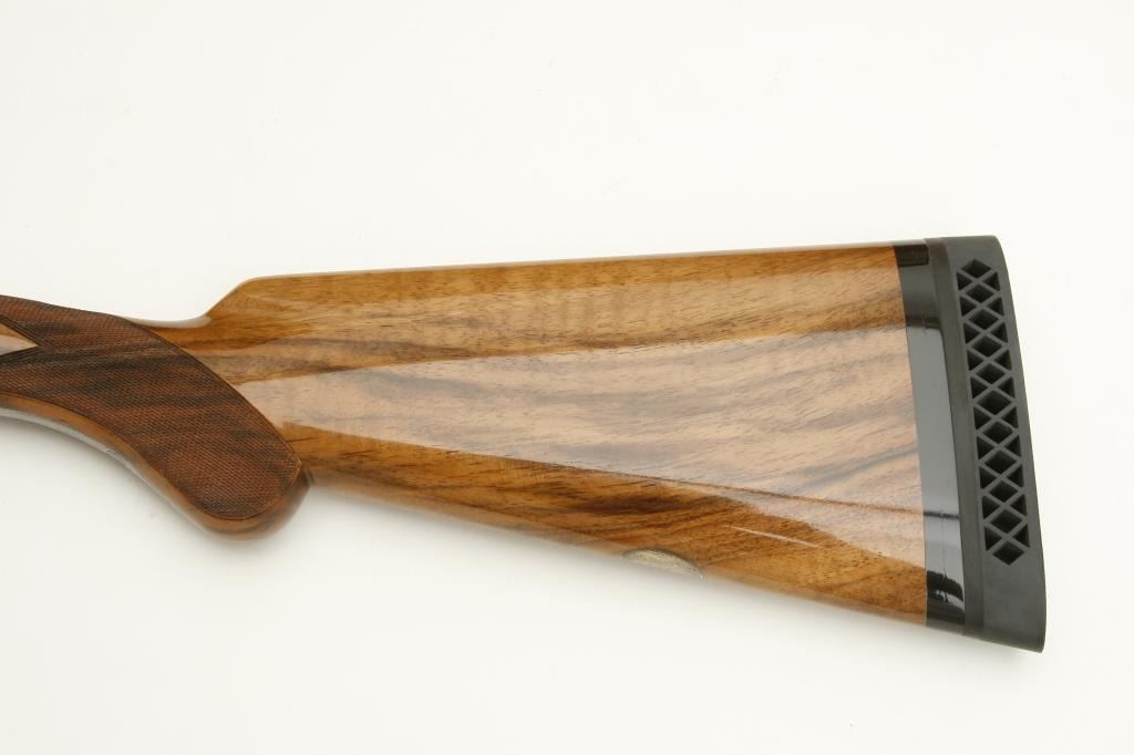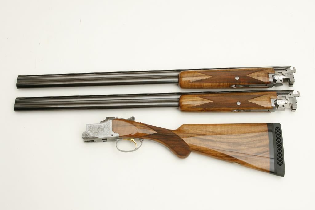 Belgian made Browning Pigeon Grade two barrel set, 20 gauge, 28” O/U ventilated rib barrels, Full-Modified and Full-Improved Cylinder choked, single gold trigger, blue barrels, engraved bright receiver, long tang, deluxe checkered wood stocks with round knob; L.O.P. is 12.75” to end of wood and 14.25” to end of Pachmayr hard rubber butt pad, S/N 31075V4, in overall excellent to like new condition; accompanied by a Browning lined leather suitcase style hard case. (Modern). Est.: $5,000-$10,000.