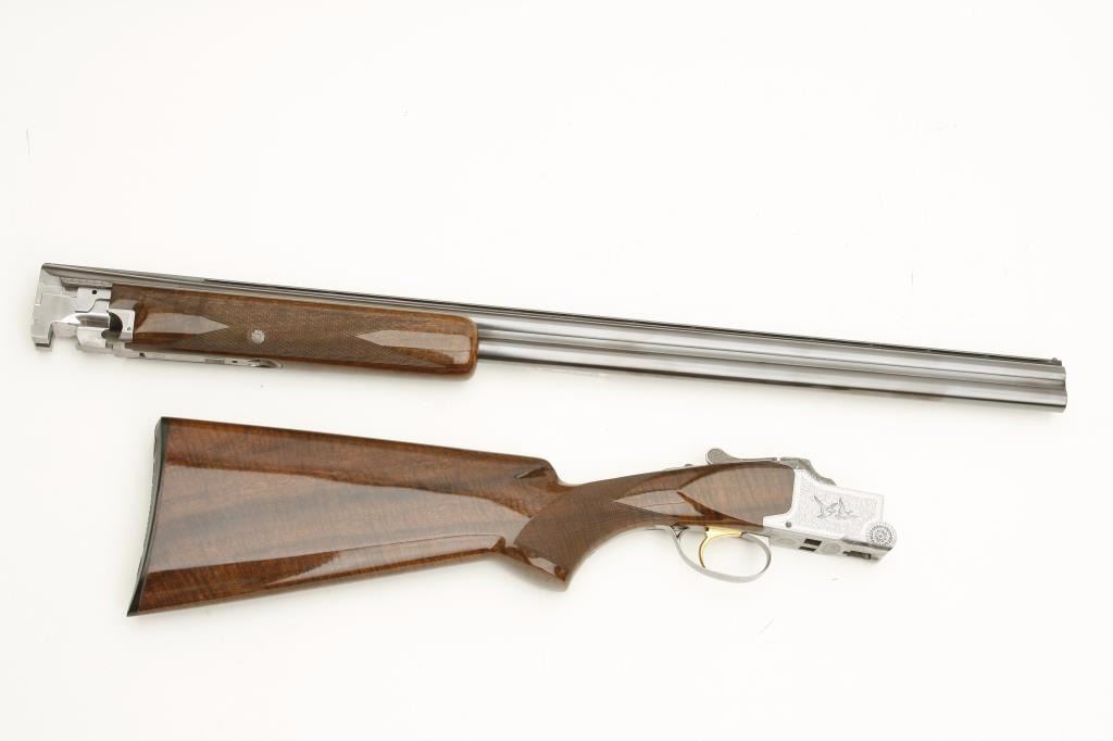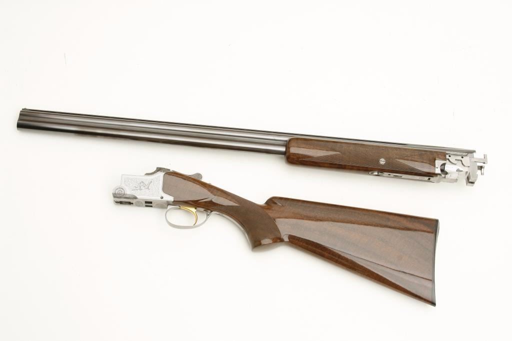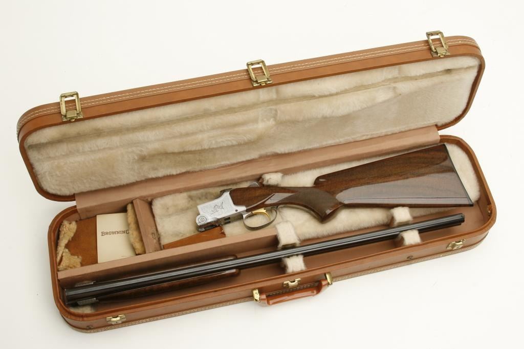 20 gauge, Full-Modified choked, 28” ventilated rib barrels, blued barrels, engraved bright receiver, single gold trigger, checkered wood stocks, L.O.P. is 14.5” to end of Browning plastic butt plate, S/N 1634V72, in overall excellent to like new condition and accompanied by a Browning lined leather suitcase style hard case. (Modern). Est.: $3,000-$6,000.